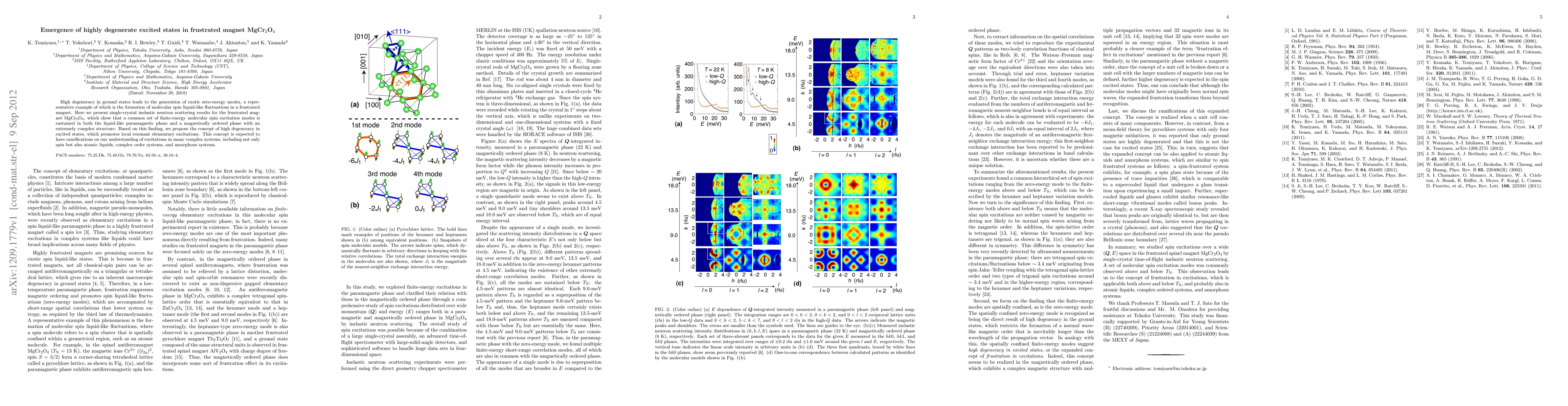 This study reveals highly degenerate excited states in the frustrated magnet MgCr$_2$O$_4$, showing sustained finite-energy molecular spin excitations across different phases. The findings propose a new concept of high degeneracy in excited states, suggesting broader implications for understanding excitations in various complex systems.