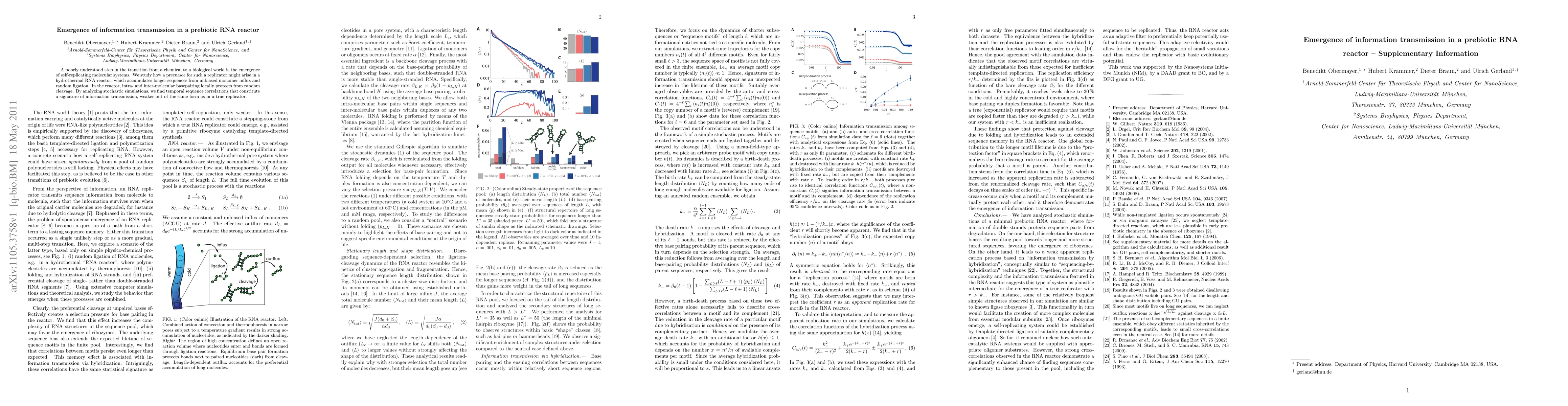 This research investigates the emergence of self-replicating molecular systems in a prebiotic RNA reactor, finding that sequence correlations indicative of information transmission arise from intra- and inter-molecular basepairing, suggesting a precursor for true replication. Stochastic simulations reveal these correlations, hinting at the potential for information transmission in early molecular systems.