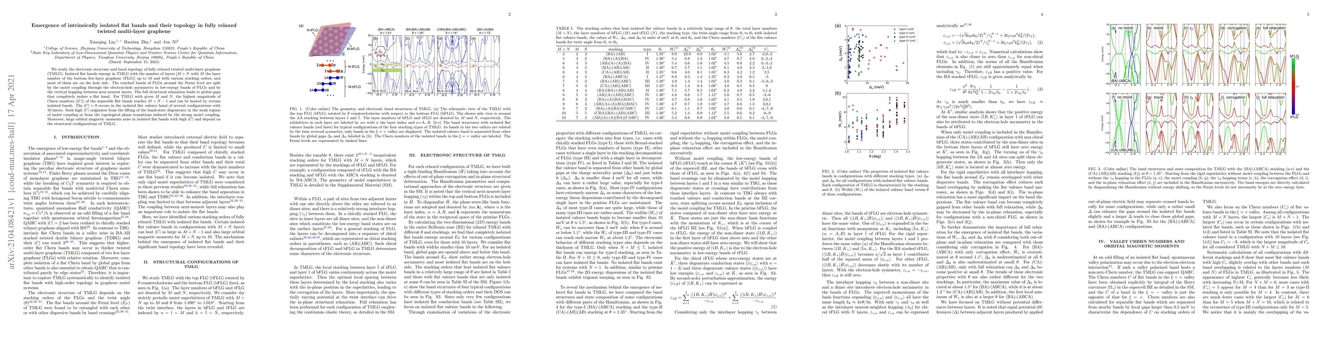 Research on fully relaxed twisted multi-layer graphene reveals the emergence of intrinsically isolated flat bands with varying Chern numbers, leading to large orbital magnetic moments, depending on structural configurations.