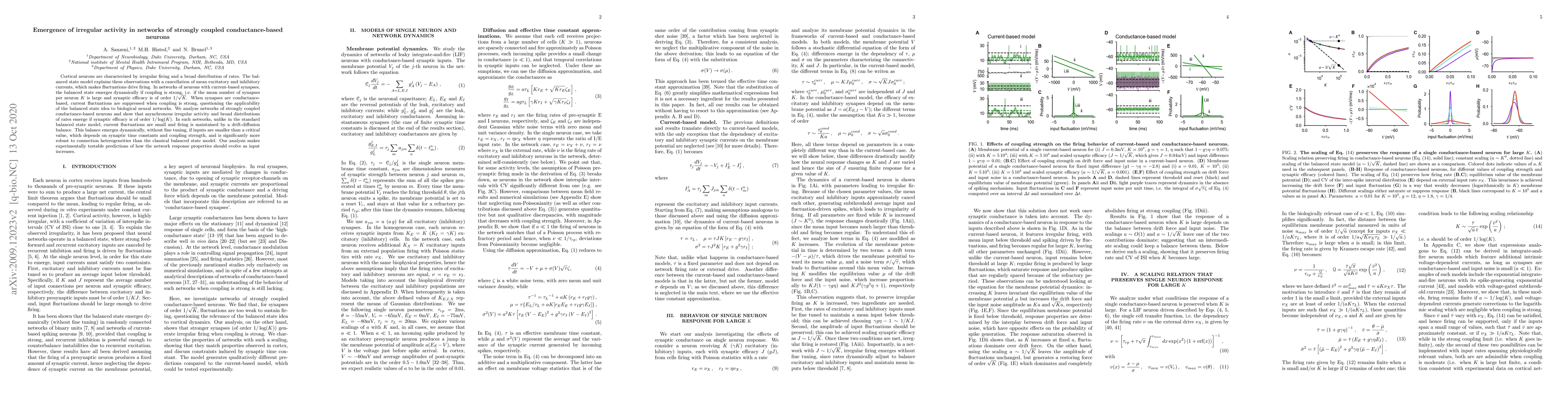 Networks of strongly coupled conductance-based neurons exhibit irregular activity and broad rate distributions when synapses have a certain efficiency, emerging dynamically without fine-tuning under specific conditions.