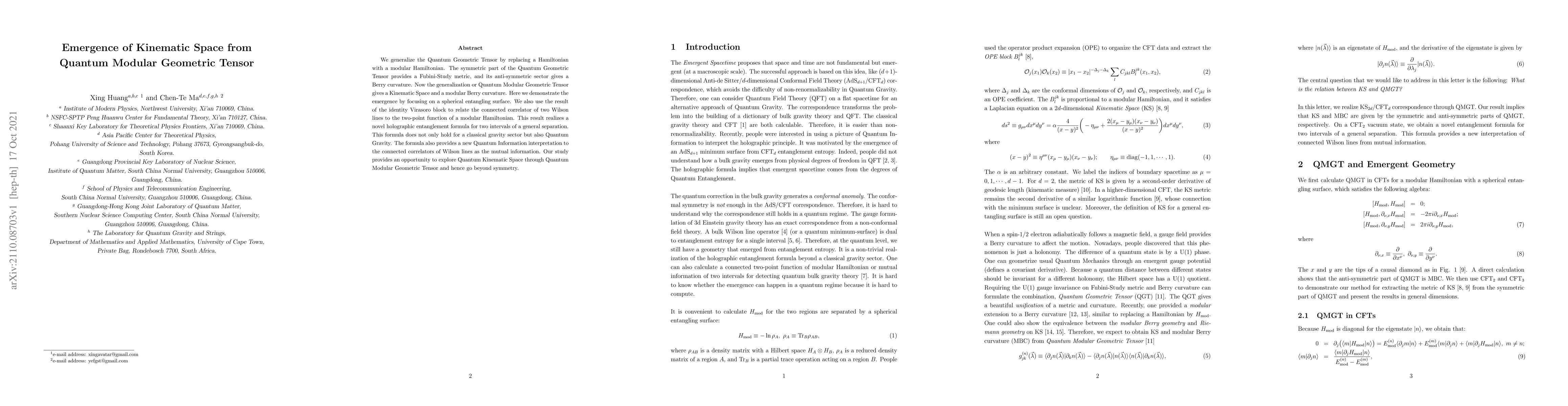 We generalize the Quantum Geometric Tensor by replacing a Hamiltonian with a modular Hamiltonian. The symmetric part of the Quantum Geometric Tensor provides a Fubini-Study metric, and its anti-symmetric sector gives a Berry curvature. Now the generalization or Quantum Modular Geometric Tensor gives a Kinematic Space and a modular Berry curvature. Here we demonstrate the emergence by focusing on a spherical entangling surface. We also use the result of the identity Virasoro block to relate the connected correlator of two Wilson lines to the two-point function of a modular Hamiltonian. This result realizes a novel holographic entanglement formula for two intervals of a general separation. This formula does not only hold for a classical gravity sector but also Quantum Gravity. The formula also provides a new Quantum Information interpretation to the connected correlators of Wilson lines as the mutual information. Our study provides an opportunity to explore Quantum Kinematic Space through Quantum Modular Geometric Tensor and hence go beyond symmetry.