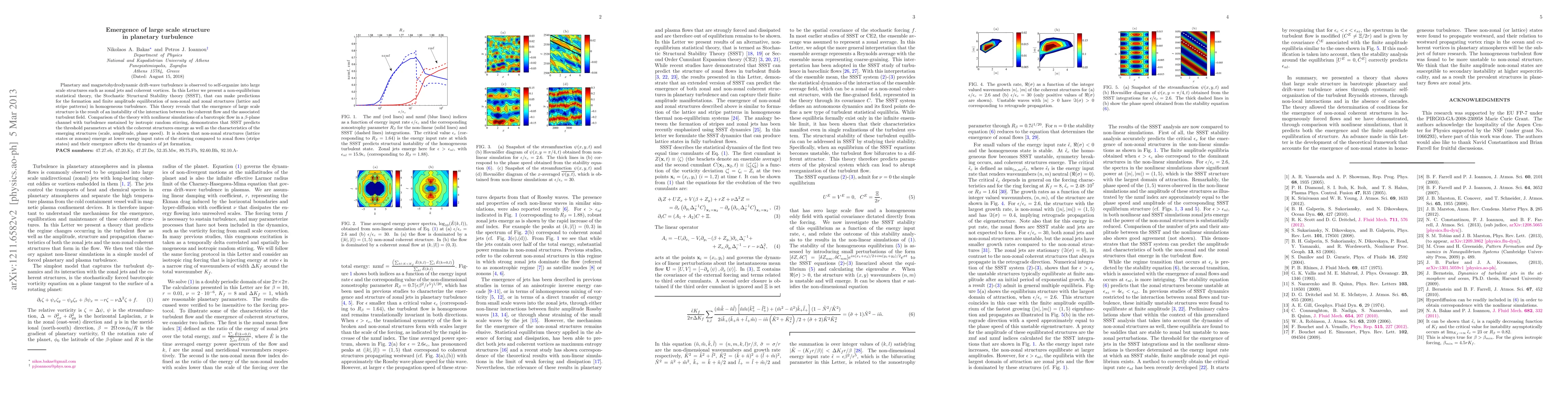This paper introduces the Stochastic Structural Stability theory (SSST) to predict the formation of large scale structures like zonal jets and coherent vortices in planetary turbulence. The theory shows that these structures emerge due to instabilities in the interaction between coherent flows and turbulent fields, and it accurately predicts the threshold parameters and characteristics of the structures.