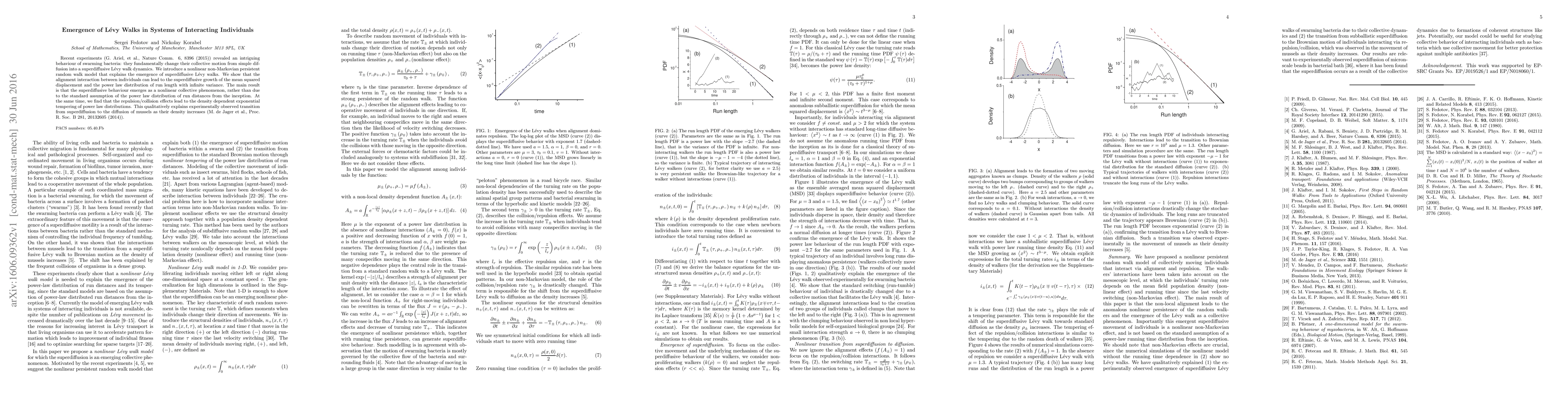 Recent experiments (G. Ariel, et al., Nature Comm. 6, 8396 (2015)) revealed an intriguing behavior of swarming bacteria: they fundamentally change their collective motion from simple diffusion into a superdiffusive L\'{e}vy walk dynamics. We introduce a nonlinear non-Markovian persistent random walk model that explains the emergence of superdiffusive L\'{e}vy walks. We show that the alignment interaction between individuals can lead to the superdiffusive growth of the mean squared displacement and the power law distribution of run length with infinite variance. The main result is that the superdiffusive behavior emerges as a nonlinear collective phenomenon, rather than due to the standard assumption of the power law distribution of run distances from the inception. At the same time, we find that the repulsion/collision effects lead to the density dependent exponential tempering of power law distributions. This qualitatively explains experimentally observed transition from superdiffusion to the diffusion of mussels as their density increases (M. de Jager et al., Proc. R. Soc. B 281, 20132605 (2014)).
