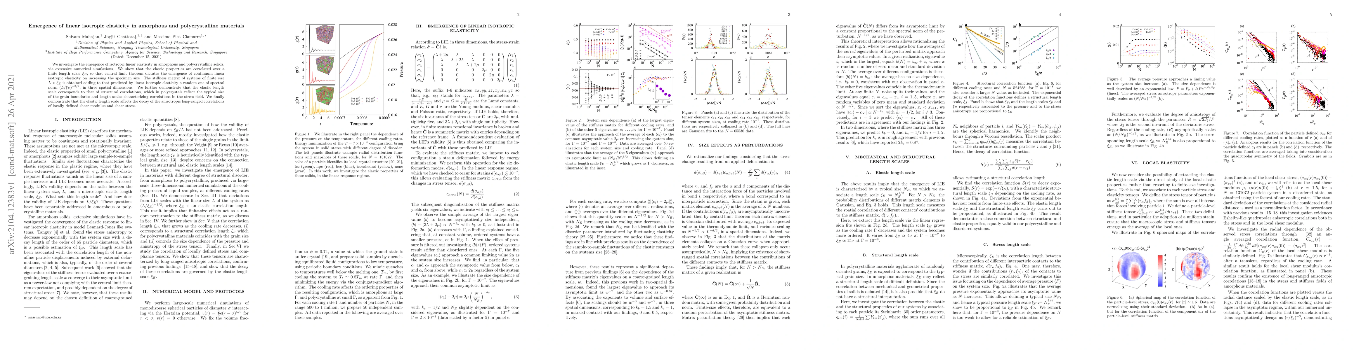 This paper explores how linear isotropic elasticity emerges in amorphous and polycrystalline materials through numerical simulations, revealing that elastic properties correlate over a length scale $\xi_E$. It shows that continuum elasticity arises as the specimen size increases, with a stiffness matrix deviation proportional to $(L/\xi_E)^{-3/2}$.