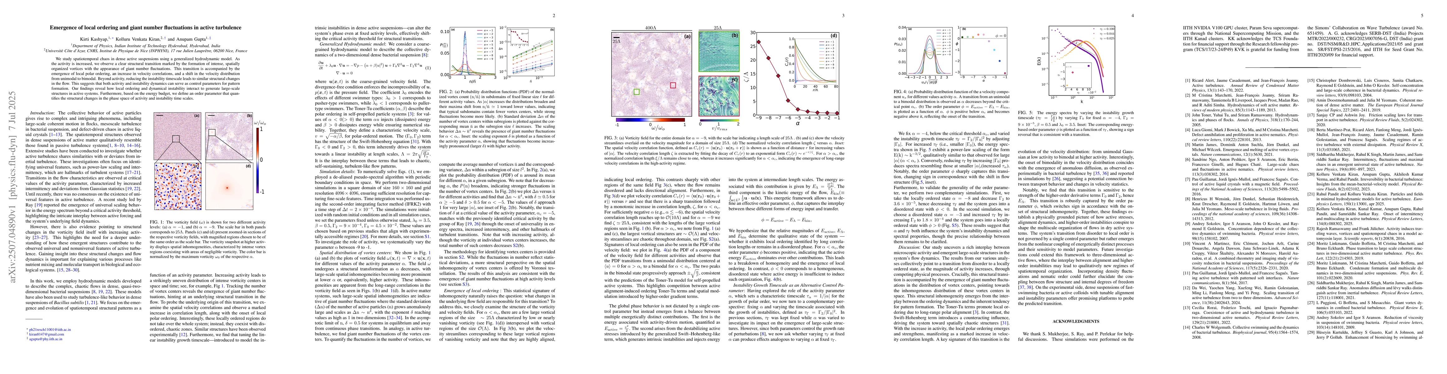 We study spatiotemporal chaos in dense active suspensions using a generalized hydrodynamic model. As the activity is increased, we observe a clear structural transition marked by the formation of intense, spatially organized vortices with the appearance of giant number fluctuations. This transition is accompanied by the emergence of local polar ordering, an increase in velocity correlations, and a shift in the velocity distribution from unimodal to bimodal. Beyond activity, reducing the instability timescale leads to similar structural changes in the flow. This suggests that both activity and instability dynamics can serve as control parameters for pattern formation. Our findings reveal how local ordering and dynamical instability interact to generate large-scale structures in active systems. Furthermore, based on the energy budget, we define an order parameter that quantifies the structural changes in the phase space of activity and instability time scales.