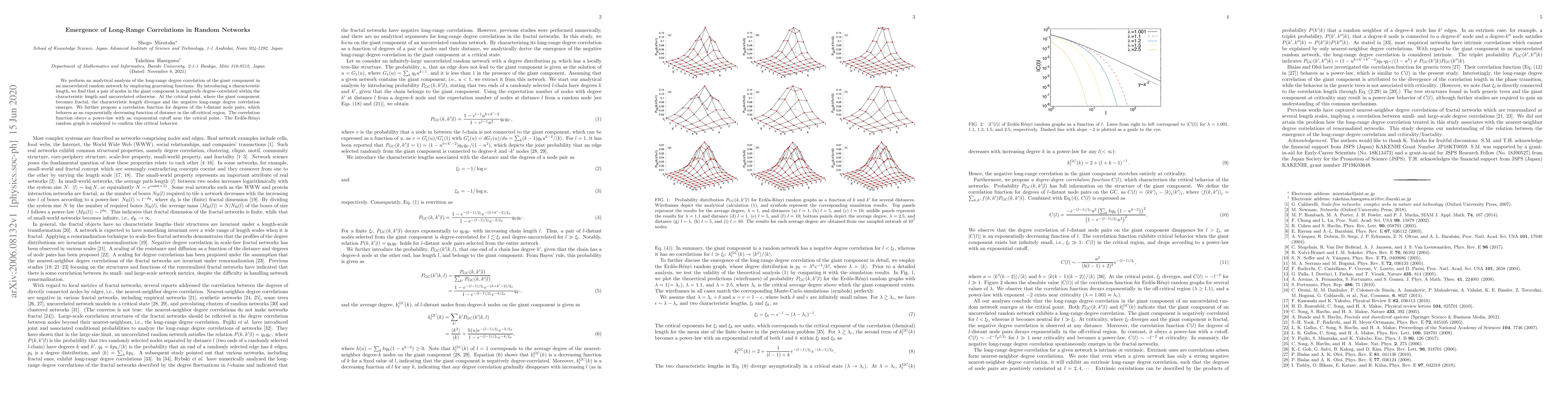We perform an analytical analysis of the long-range degree correlation of the giant component in an uncorrelated random network by employing generating functions. By introducing a characteristic length, we find that a pair of nodes in the giant component is negatively degree-correlated within the characteristic length and uncorrelated otherwise. At the critical point, where the giant component becomes fractal, the characteristic length diverges and the negative long-range degree correlation emerges. We further propose a correlation function for degrees of the $l$-distant node pairs, which behaves as an exponentially decreasing function of distance in the off-critical region. The correlation function obeys a power-law with an exponential cutoff near the critical point. The Erd\H{o}s-R\'{e}nyi random graph is employed to confirm this critical behavior.