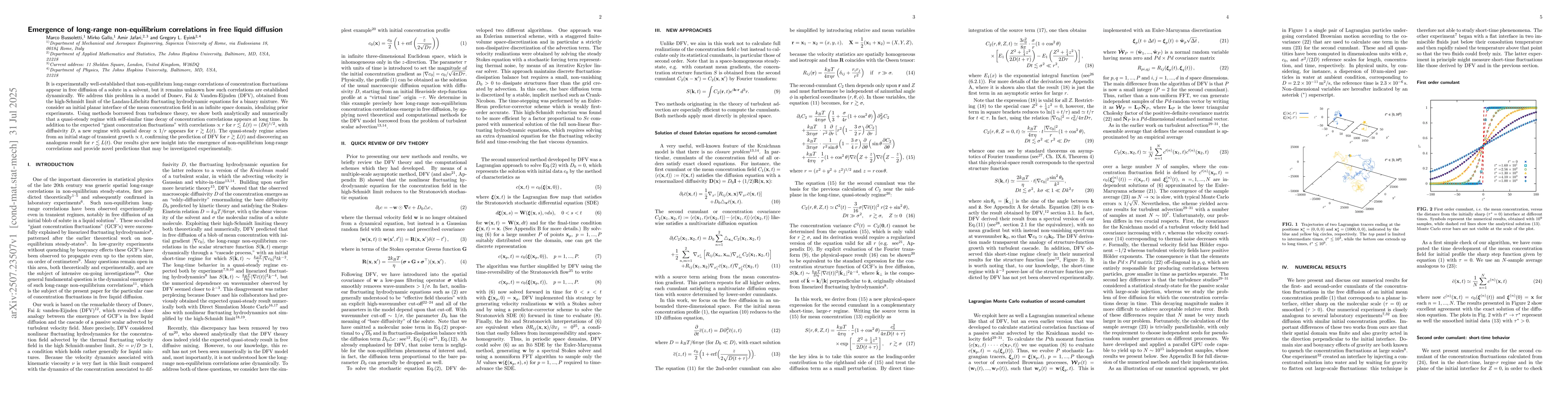 It is experimentally well-established that non-equilibrium long-range correlations of concentration fluctuations appear in free diffusion of a solute in a solvent, but it remains unknown how such correlations are established dynamically. We address this problem in a model of Donev, Fai \& Vanden-Eijnden (DFV), obtained from the high-Schmidt limit of the Landau-Lifschitz fluctuating hydrodynamic equations for a binary mixture. We consider an initial planar interface of the mean concentration field in an infinite space domain, idealizing prior experiments. Using methods borrowed from turbulence theory, we show both analytically and numerically that a quasi-steady regime with self-similar time decay of concentration correlations appears at long time. In addition to the expected ``giant concentration fluctuations'' with correlations $\propto r$ for $r\lesssim L(t)=(Dt)^{1/2},$ with diffusivity $D,$ a new regime with spatial decay $\propto 1/r$ appears for $r\gtrsim L(t).$ The quasi-steady regime arises from an initial stage of transient growth $\propto t,$ confirming the prediction of DFV for $r\gtrsim L(t)$ and discovering an analogous result for $r\lesssim L(t).$ Our results give new insight into the emergence of non-equilibrium long-range correlations and provide novel predictions that may be investigated experimentally.