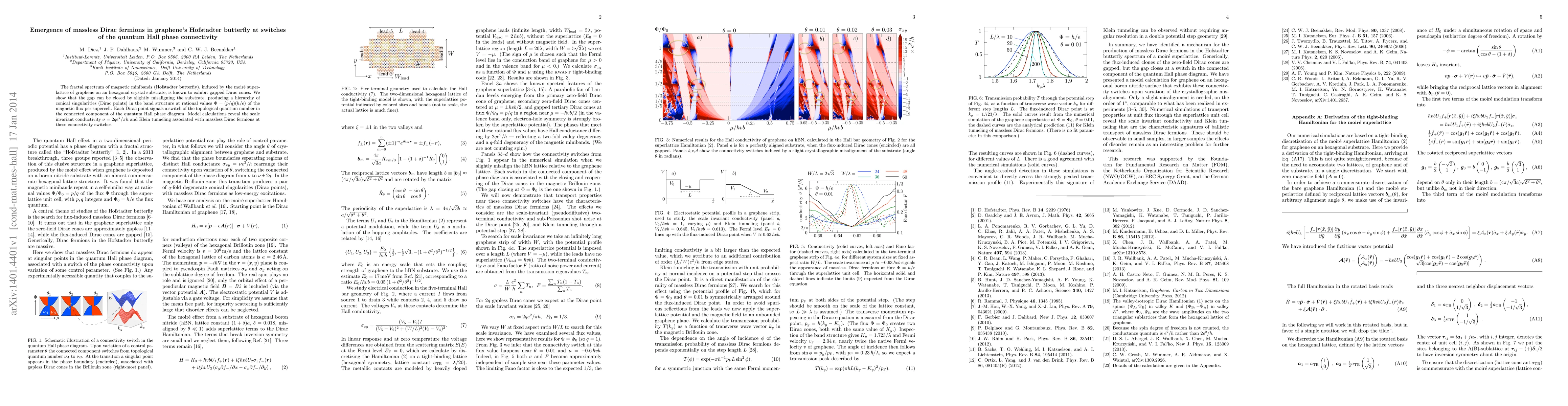 This paper demonstrates that slight misalignments in graphene's substrate can close the gap in its magnetic minibands, leading to massless Dirac fermions at specific rational flux values. These Dirac points correspond to topological phase transitions in the quantum Hall effect, accompanied by scale-invariant conductivity and Klein tunneling.
