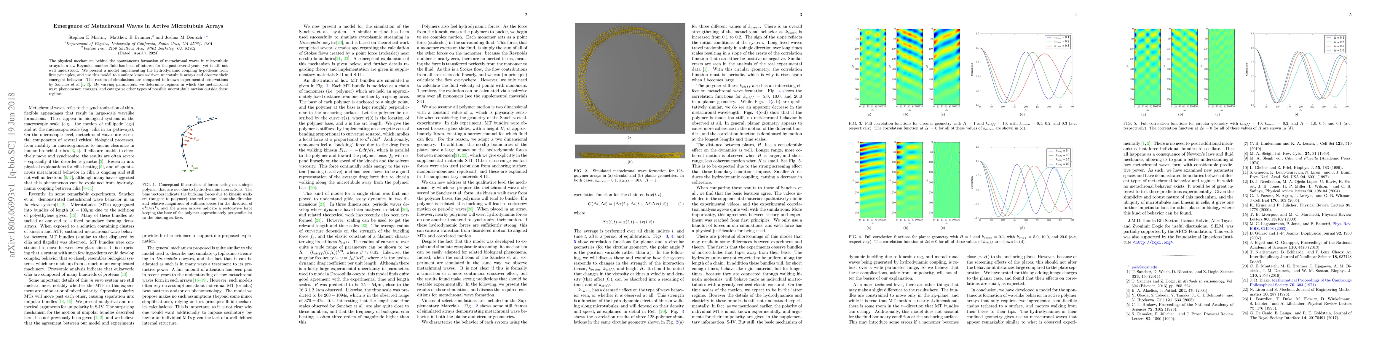 This paper models the hydrodynamic coupling of kinesin-driven microtubule arrays to explore the emergence of metachronal waves in low Reynolds number fluids, comparing simulation results to experimental observations and identifying the conditions that lead to this phenomenon.