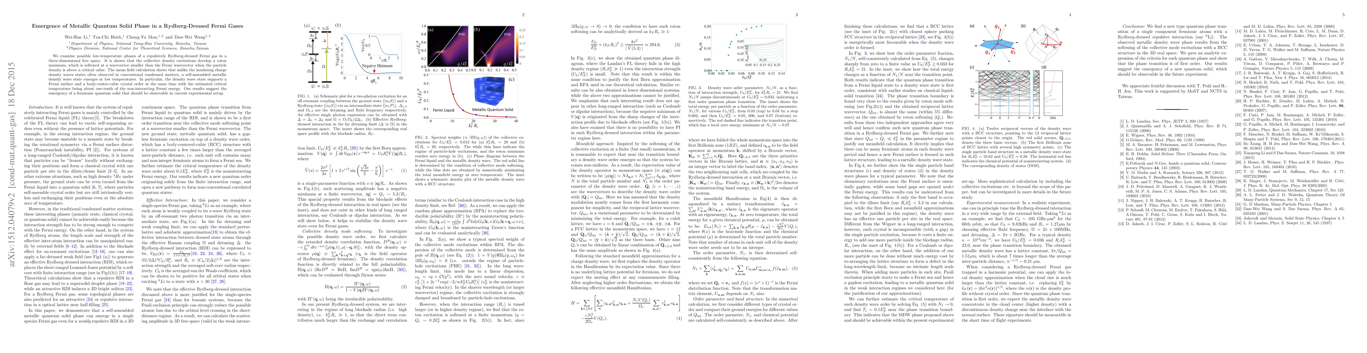 This research reveals the emergence of a metallic quantum solid phase in Rydberg-dressed Fermi gases characterized by a self-assembled metallic density wave, supporting a Fermi surface and body-center-cubic crystal order, observed above a critical particle density and at temperatures near one-tenth of the non-interacting Fermi energy.
