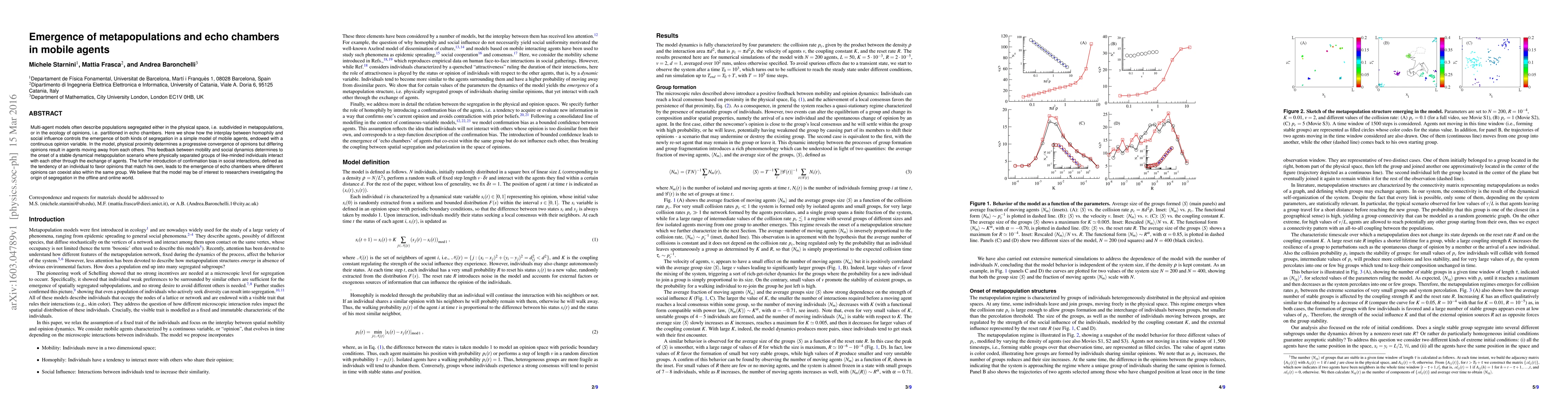This paper explores how homophily and social influence lead to the formation of metapopulations and echo chambers in mobile agents with continuous opinion variables. The model shows that physical proximity and differing opinions drive agents to form segregated groups, with confirmation bias further creating echo chambers within the same group.