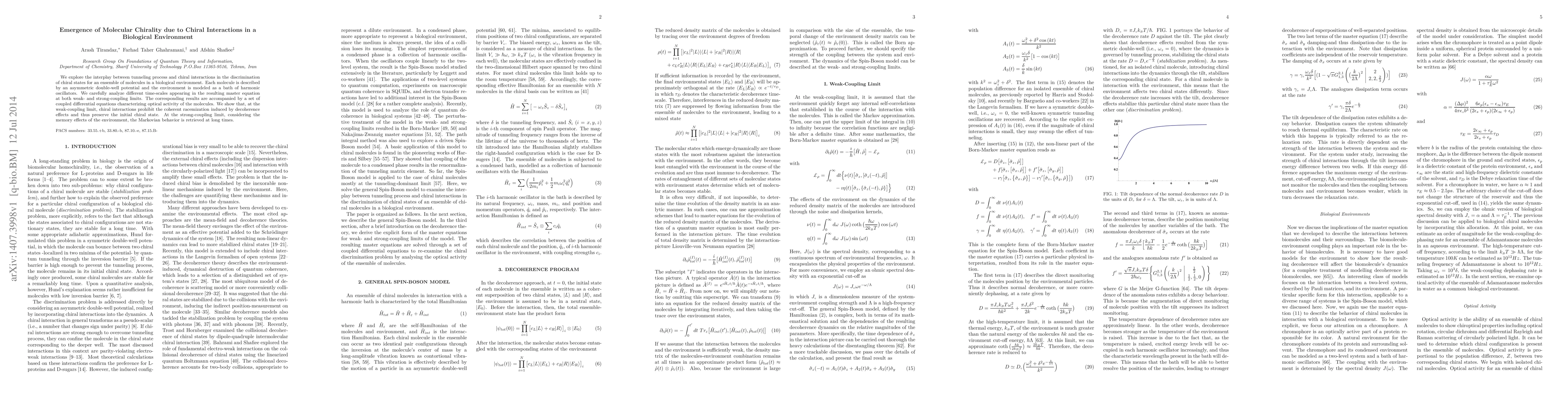 We explore the interplay between tunneling process and chiral interactions in the discrimination of chiral states for an ensemble of molecules in a biological environment. Each molecule is described by an asymmetric double-well potential and the environment is modeled as a bath of harmonic oscillators. We carefully analyze different time-scales appearing in the resulting master equation at both weak- and strong-coupling limits. The corresponding results are accompanied by a set of coupled differential equations characterizing optical activity of the molecules. We show that, at the weak-coupling limit, chiral interactions prohibit the coherent racemization induced by decoherence effects and thus preserve the initial chiral state. At the strong-coupling limit, considering the memory effects of the environment, Markovian behavior is observed at long times.