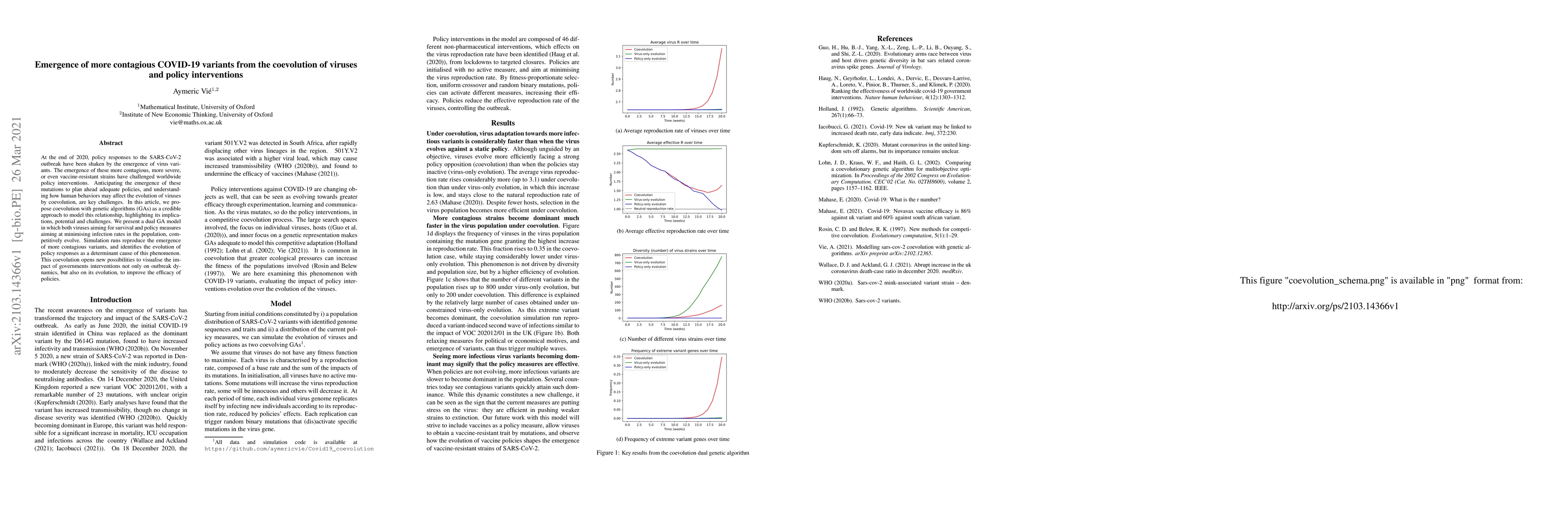 At the end of 2020, policy responses to the SARS-CoV-2 outbreak have been shaken by the emergence of virus variants. The emergence of these more contagious, more severe, or even vaccine-resistant strains have challenged worldwide policy interventions. Anticipating the emergence of these mutations to plan ahead adequate policies, and understanding how human behaviors may affect the evolution of viruses by coevolution, are key challenges. In this article, we propose coevolution with genetic algorithms (GAs) as a credible approach to model this relationship, highlighting its implications, potential and challenges. We present a dual GA model in which both viruses aiming for survival and policy measures aiming at minimising infection rates in the population, competitively evolve. Simulation runs reproduce the emergence of more contagious variants, and identifies the evolution of policy responses as a determinant cause of this phenomenon. This coevolution opens new possibilities to visualise the impact of governments interventions not only on outbreak dynamics, but also on its evolution, to improve the efficacy of policies.