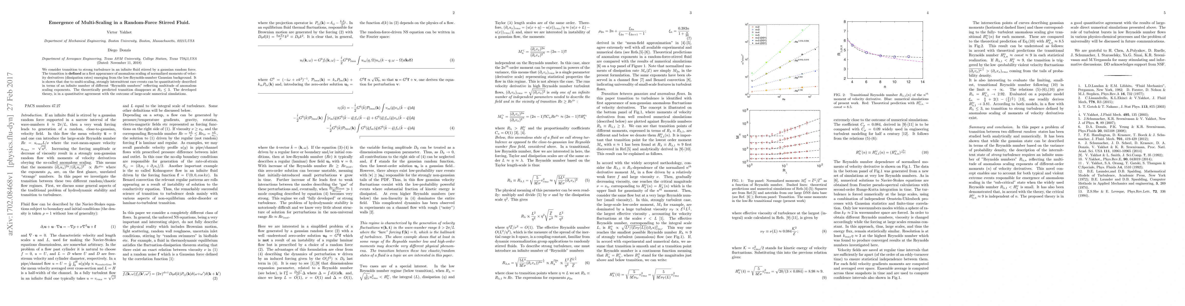 We consider transition to strong turbulence in an infinite fluid stirred by a gaussian random force. The transition is {\bf defined} as a first appearance of anomalous scaling of normalized moments of velocity derivatives (dissipation rates) emerging from the low-Reynolds-number Gaussian background. It is shown that due to multi-scaling, strongly intermittent rare events can be quantitatively described in terms of an infinite number of different "Reynolds numbers" reflecting multitude of anomalous scaling exponents. The theoretically predicted transition disappears at $R_{\lambda}\leq 3$. The developed theory, is in a quantitative agreement with the outcome of large-scale numerical simulations.