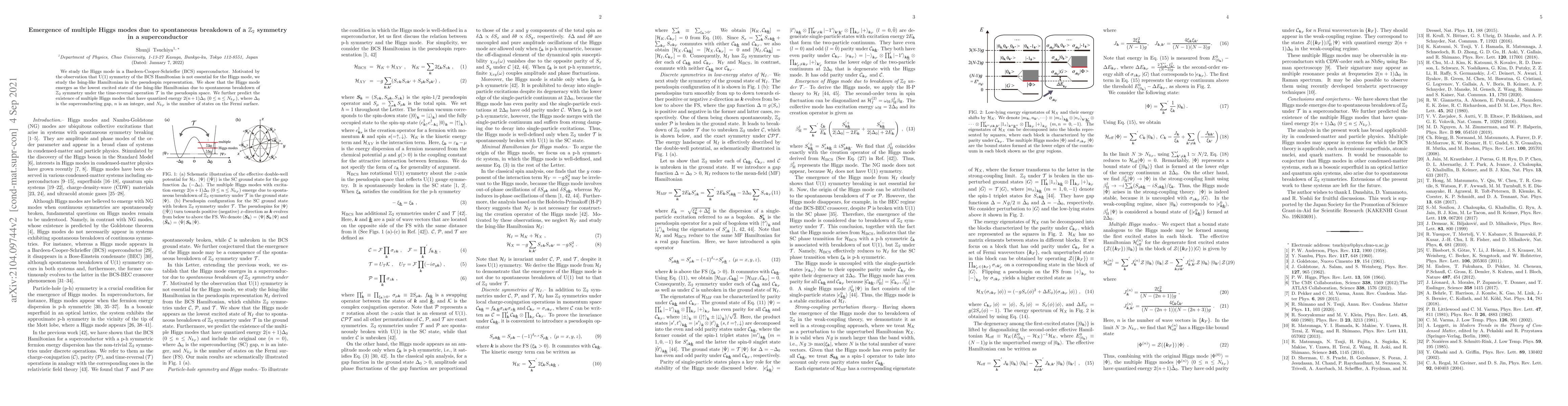 We study the Higgs mode in a Bardeen-Cooper-Schrieffer (BCS) superconductor. Motivated by the observation that U(1) symmetry of the BCS Hamiltonian is not essential for the Higgs mode, we study the Ising-like Hamiltonian in the pseudospin representation. We show that the Higgs mode emerges as the lowest excited state of the Ising-like Hamiltonian due to spontaneous breakdown of $\mathbb{Z}_2$ symmetry under the time-reversal operation $\mathcal T$ in the pseudospin space. We further predict the existence of multiple Higgs modes that have quantized energy $2(n+1)\Delta_0$ ($0\le n\le N_{k_F}$), where $\Delta_0$ is the superconducting gap, $n$ is an integer, and $N_{k_F}$ is the number of states on the Fermi surface.