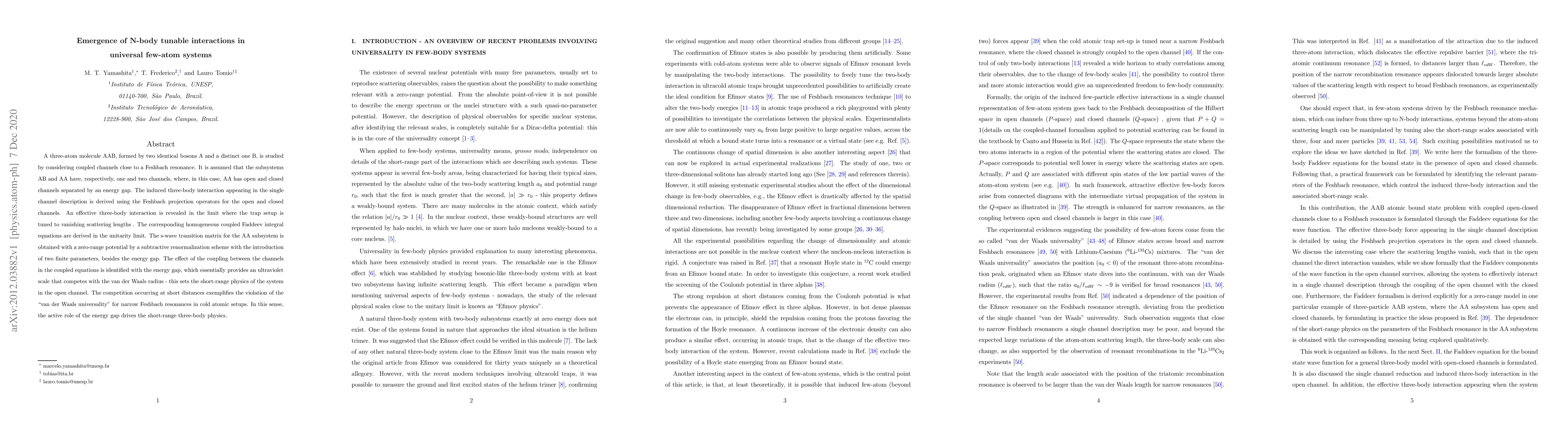 A three-atom molecule AAB, formed by two identical bosons A and a distinct one B, is studied by considering coupled channels close to a Feshbach resonance. It is assumed that the subsystems AB and AA have, respectively, one and two channels, where, in this case, AA has open and closed channels separated by an energy gap. The induced three-body interaction appearing in the single channel description is derived using the Feshbach projection operators for the open and closed channels. An effective three-body interaction is revealed in the limit where the trap setup is tuned to vanishing scattering lengths . The corresponding homogeneous coupled Faddeev integral equations are derived in the unitarity limit. The s-wave transition matrix for the AA subsystem is obtained with a zero-range potential by a subtractive renormalization scheme with the introduction of two finite parameters, besides the energy gap. The effect of the coupling between the channels in the coupled equations is identified with the energy gap, which essentially provides an ultraviolet scale that competes with the van der Waals radius - this sets the short-range physics of the system in the open channel. The competition occurring at short distances exemplifies the violation of the ``van der Waals universality" for narrow Feshbach resonances in cold atomic setups. In this sense, the active role of the energy gap drives the short-range three-body physics.