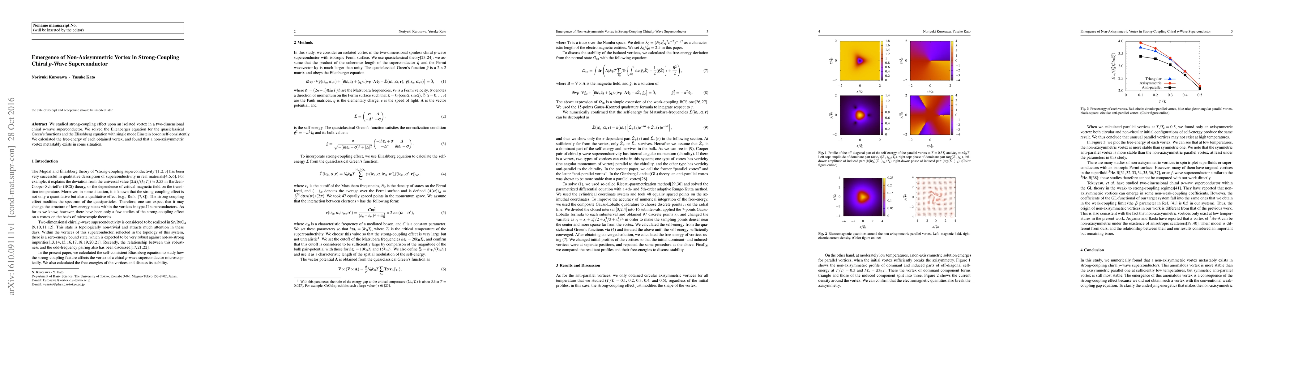 This research explores the strong-coupling effect on an isolated vortex in a two-dimensional chiral p-wave superconductor, revealing the emergence of a non-axisymmetric vortex metastably under certain conditions through solving the Eilenberger and Eliashberg equations.