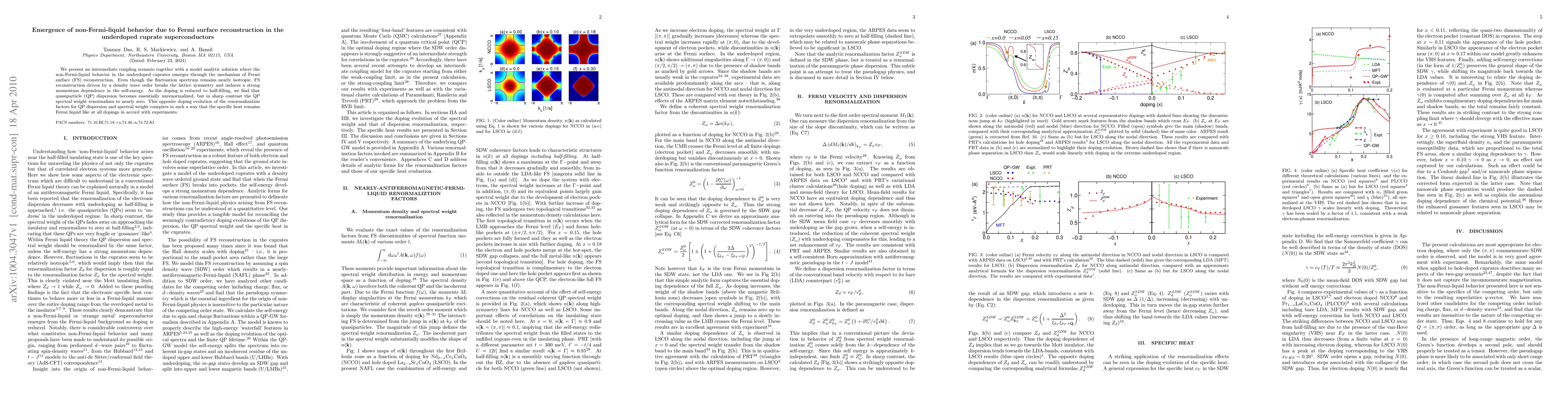 This paper explores the emergence of non-Fermi-liquid behavior in underdoped cuprate superconductors through Fermi surface reconstruction, revealing that while quasiparticle dispersion remains unrenormalized, spectral weight renormalizes to nearly zero, maintaining Fermi-liquid-like specific heat behavior.
