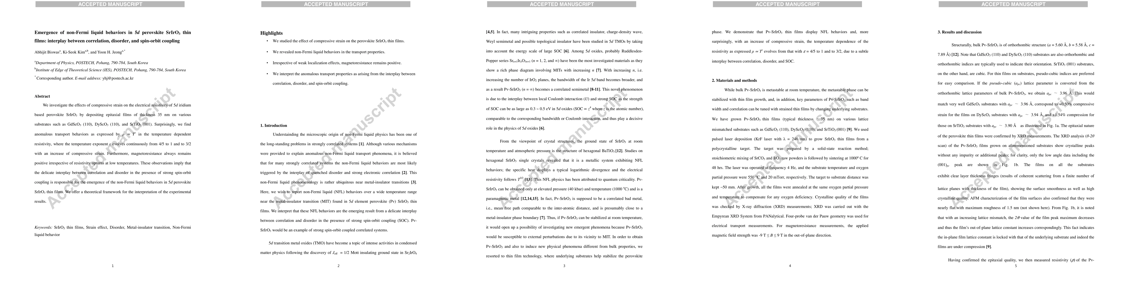 This study explores the impact of compressive strain on the electrical resistivity of SrIrO3 perovskite thin films, revealing non-Fermi liquid behaviors characterized by evolving temperature exponents. The findings suggest that the interplay between correlation, disorder, and strong spin-orbit coupling drives these anomalous transport properties.
