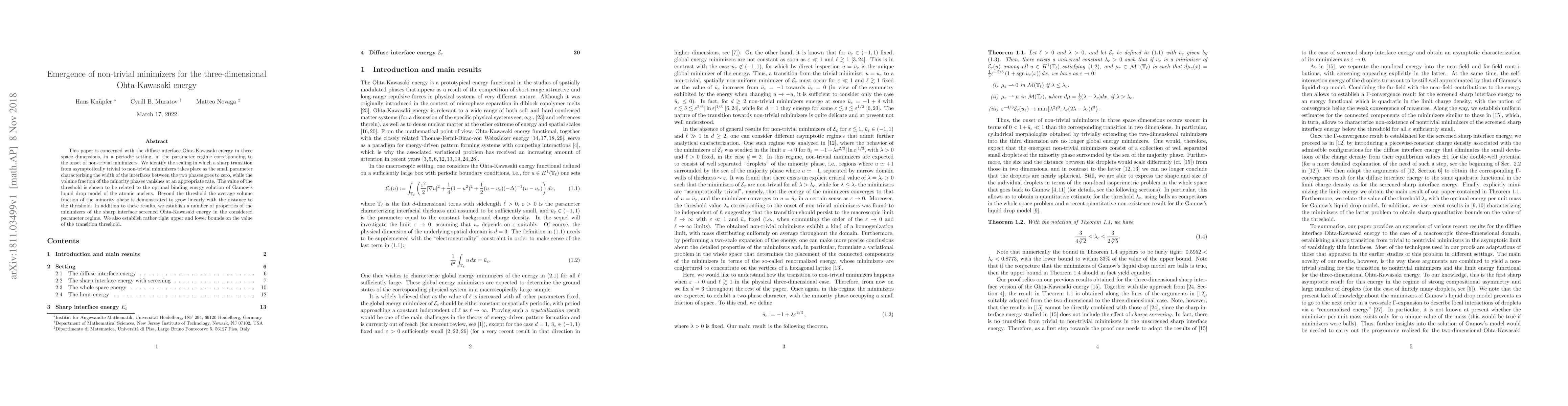 This paper investigates the emergence of non-trivial minimizers for the three-dimensional Ohta-Kawasaki energy, identifying the scaling for the transition from trivial to non-trivial minimizers as the interface width parameter approaches zero. The threshold for this transition is linked to Gamow's liquid drop model, and beyond the threshold, the average volume fraction of minority phases grows linearly with the distance to the threshold.