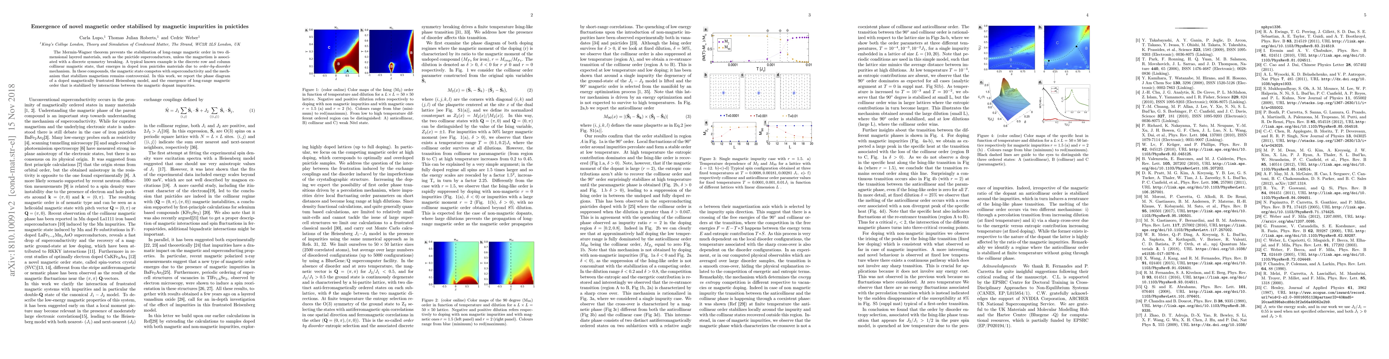 We examine the temperature dependence of the magnetic ordering in the frustrated Heisenberg $J_1-J_2$ model in presence of two different kind of dopants: vacancies or magnetic impurities. We demonstrate that, irrespective to their magnetic ratio, the introduction of impurities quenches the order by disorder selection mechanism associated with an Ising-like phase transition at low temperatures and gives way to a $90^\circ$ (anticollinear) order . The presence of dopants triggers a non trivial competition between entropically selected states (collinear) and energetically favoured ones (anticollinear) in dependence of both dilution and temperature. While in case of magnetic impurity, the interesting magnetic phases are observed for full range of temperature and doping, in case of nonmagnetic impurities every magnetic order is destroyed at all temperatures above $12\%$ dilution. At fixed low temperature and tuning the doping we show a first order phase transition leading to the re-entrance of the Ising-like order with percolation of islands of $90^\circ$ order. At fixed doping and varying the temperature we observe a transition from the anticollinear to the collinear phase assisted by a new emerging magnetic phase in the presence of magnetic impurities, whilst in case of vacancies this transition is characterised by a coexistent region of both. Furthermore, tuning the magnetic moment of the impurities, a complete collapse of the Ising-like order is attained. This is in agreement with observations of Ir dopant atoms in superconducting Ba(Fe$_{1-x}$Ir$_x$)$_2$As$_2$ with $x<0.047$.