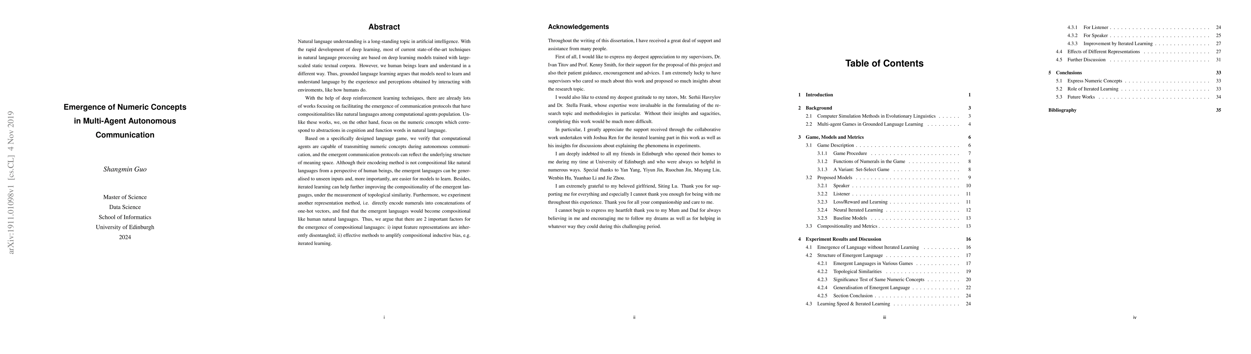 Computational agents can learn and understand numeric concepts through autonomous communication, leading to emergent languages that reflect underlying structure of meaning space. These languages can generalize to unseen inputs and improve compositionality with iterated learning.