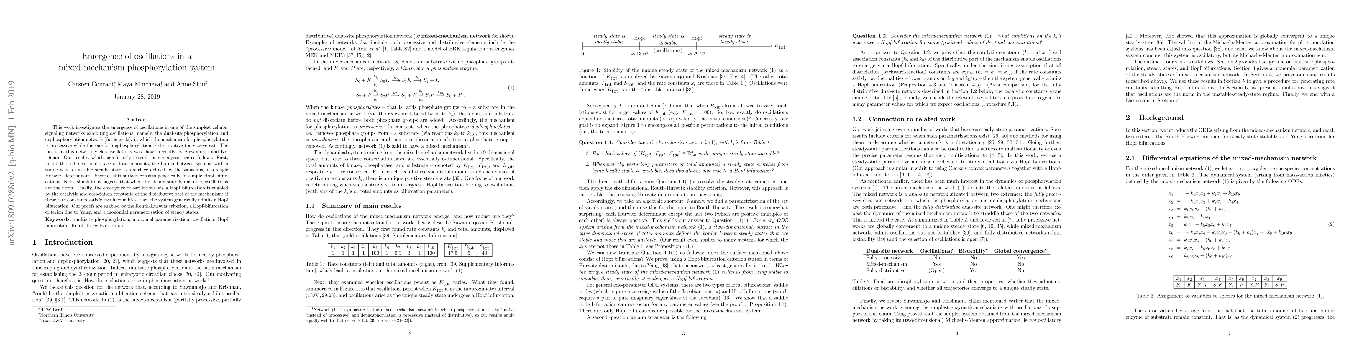 This paper explores the conditions under which oscillations arise in a mixed-mechanism phosphorylation system, revealing that a Hopf bifurcation surface defines the boundary between stable and unstable steady states. The study shows that oscillations are likely when the steady state is unstable, and identifies specific inequalities on catalytic and association constants that enable the emergence of oscillations via Hopf bifurcation.