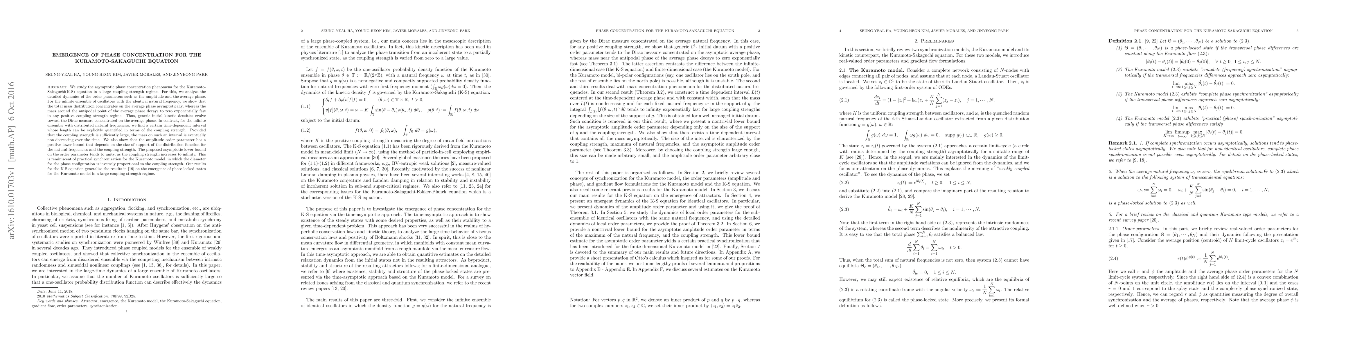 We study the asymptotic phase concentration phenomena for the Kuramoto-Sakaguchi(K-S) equation in a large coupling strength regime. For this, we analyze the detailed dynamics of the order parameters such as the amplitude and the average phase. For the infinite ensemble of oscillators with the identical natural frequency, we show that the total mass distribution concentrates on the average phase asymptotically, whereas the mass around the antipodal point of the average phase decays to zero exponentially fast in any positive coupling strength regime. Thus, generic initial kinetic densities evolve toward the Dirac measure concentrated on the average phase. In contrast, for the infinite ensemble with distributed natural frequencies, we find a certain time-dependent interval whose length can be explicitly quantified in terms of the coupling strength. Provided that the coupling strength is sufficiently large, the mass on such an interval is eventually non-decreasing over the time. We also show that the amplitude order parameter has a positive lower bound that depends on the size of support of the distribution function for the natural frequencies and the coupling strength. The proposed asymptotic lower bound on the order parameter tends to unity, as the coupling strength increases to infinity. This is reminiscent of practical synchronization for the Kuramoto model, in which the diameter for the phase configuration is inversely proportional to the coupling strength. Our results for the K-S equation generalize the results in [19] on the emergence of phase-locked states for the Kuramoto model in a large coupling strength regime.
