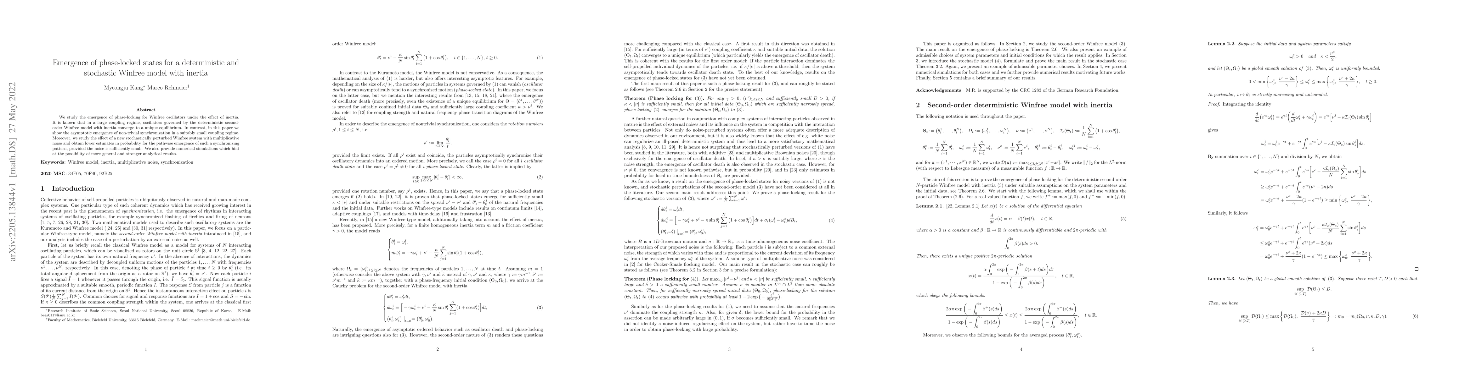 We study the emergence of phase-locking for Winfree oscillators under the effect of inertia. It is known that in a large coupling regime, oscillators governed by the deterministic second-order Winfree model with inertia converge to a unique equilibrium. In contrast, in this paper we show the asymptotic emergence of non-trivial synchronization in a suitably small coupling regime. Moreover, we study the effect of a new stochastically perturbed Winfree system with multiplicative noise and obtain lower estimates in probability for the pathwise emergence of such a synchronizing pattern, provided the noise is sufficiently small. We also provide numerical simulations which hint at the possibility of more general and stronger analytical results.