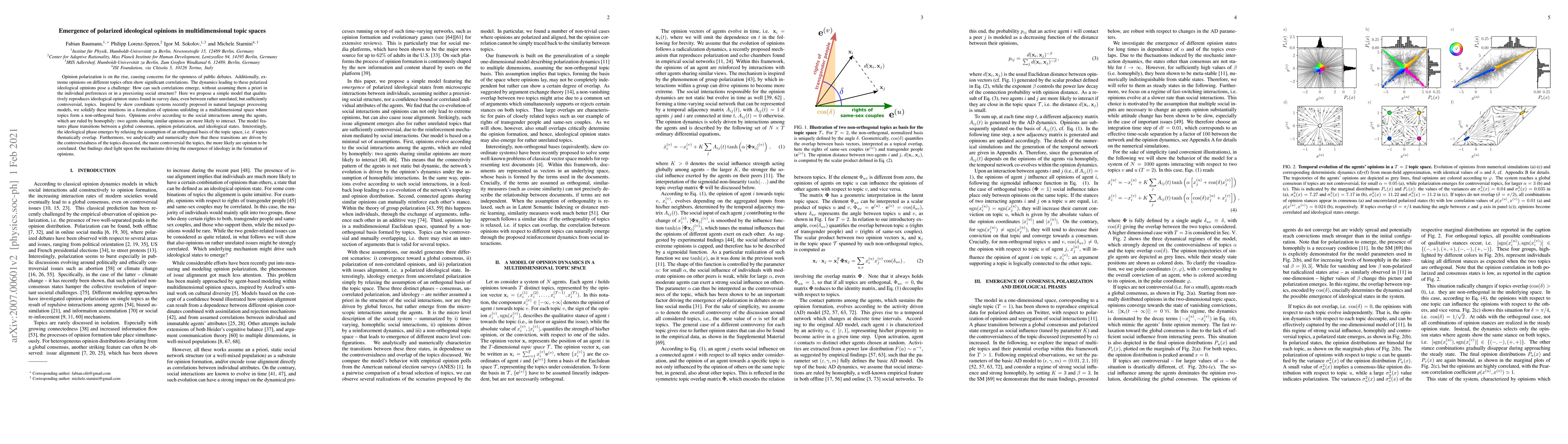 This paper proposes a model to explain how polarized ideological opinions arise in multidimensional topic spaces, driven by social interactions and homophily. It demonstrates that controversial topics and thematic overlaps can lead to opinion polarization and ideological states, offering insights into the mechanisms behind opinion formation.
