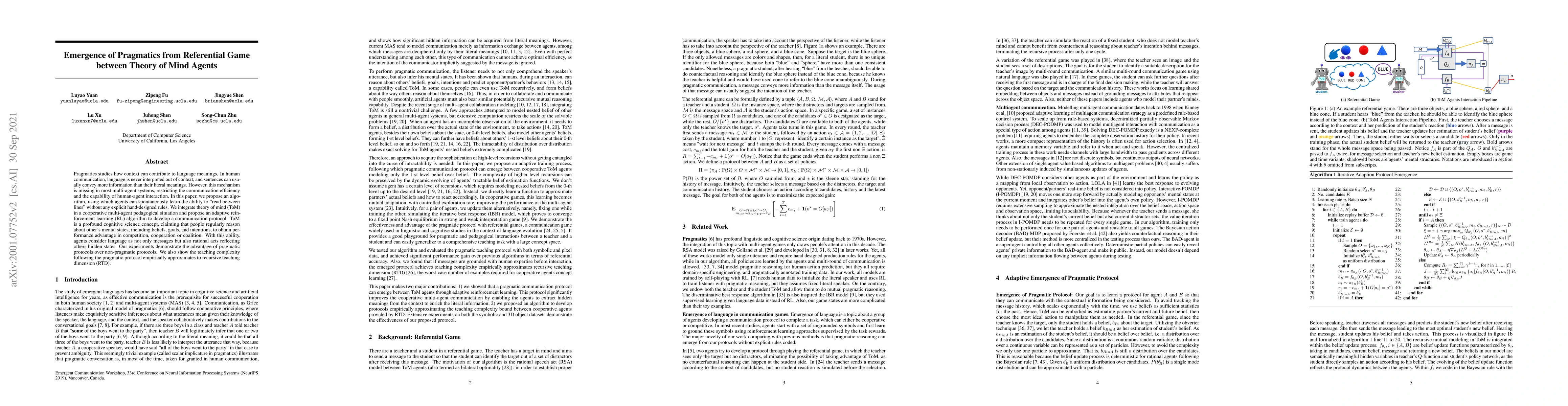 Pragmatics studies how context can contribute to language meanings. In human communication, language is never interpreted out of context, and sentences can usually convey more information than their literal meanings. However, this mechanism is missing in most multi-agent systems, restricting the communication efficiency and the capability of human-agent interaction. In this paper, we propose an algorithm, using which agents can spontaneously learn the ability to "read between lines" without any explicit hand-designed rules. We integrate the theory of mind (ToM) in a cooperative multi-agent pedagogical situation and propose an adaptive reinforcement learning (RL) algorithm to develop a communication protocol. ToM is a profound cognitive science concept, claiming that people regularly reason about other's mental states, including beliefs, goals, and intentions, to obtain performance advantage in competition, cooperation or coalition. With this ability, agents consider language as not only messages but also rational acts reflecting others' hidden states. Our experiments demonstrate the advantage of pragmatic protocols over non-pragmatic protocols. We also show the teaching complexity following the pragmatic protocol empirically approximates to recursive teaching dimension (RTD).