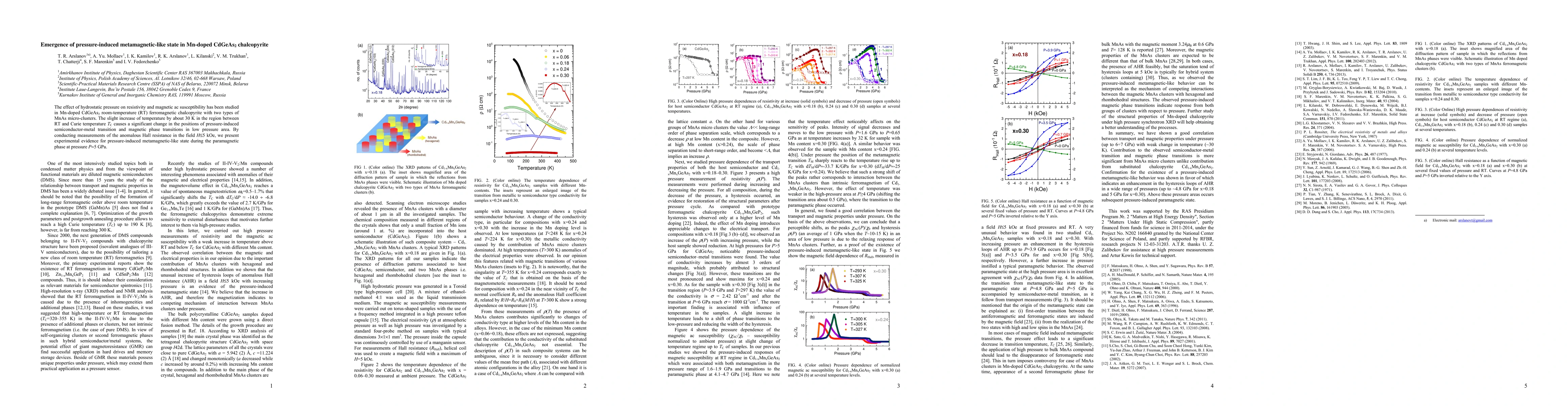 This study investigates the impact of hydrostatic pressure on Mn-doped CdGeAs2 chalcopyrite, revealing a pressure-induced metamagnetic-like state at 5 GPa. The research highlights significant shifts in semiconductor-metal and magnetic phase transitions with temperature changes near the Curie temperature.