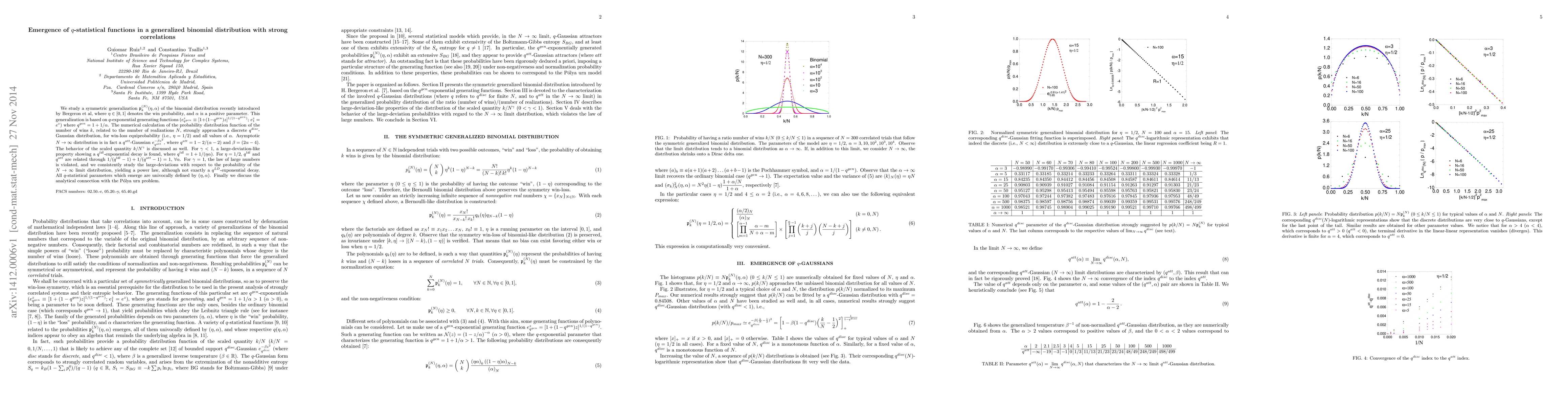 We study a symmetric generalization $\mathfrak{p}^{(N)}_k(\eta, \alpha)$ of the binomial distribution recently introduced by Bergeron et al, where $\eta \in [0,1]$ denotes the win probability, and $\alpha$ is a positive parameter. This generalization is based on $q$-exponential generating functions ($e_{q^{gen}}^z \equiv [1+(1-q^{gen})z]^{1/(1-q^{gen})};\,e_{1}^z=e^z)$ where $q^{gen}=1+1/\alpha$. The numerical calculation of the probability distribution function of the number of wins $k$, related to the number of realizations $N$, strongly approaches a discrete $q^{disc}$-Gaussian distribution, for win-loss equiprobability (i.e., $\eta=1/2$) and all values of $\alpha$. Asymptotic $N\to \infty$ distribution is in fact a $q^{att}$-Gaussian $e_{q^{att}}^{-\beta z^2}$, where $q^{att}=1-2/(\alpha-2)$ and $\beta=(2\alpha-4)$. The behavior of the scaled quantity $k/N^\gamma$ is discussed as well. For $\gamma<1$, a large-deviation-like property showing a $q^{ldl}$-exponential decay is found, where $q^{ldl}=1+1/(\eta\alpha)$. For $\eta=1/2$, $q^{ldl}$ and $q^{att}$ are related through $1/(q^{ldl}-1)+1/(q^{att}-1)=1$, $\forall \alpha$. For $\gamma=1$, the law of large numbers is violated, and we consistently study the large-deviations with respect to the probability of the $N\to\infty$ limit distribution, yielding a power law, although not exactly a $q^{LD}$-exponential decay. All $q$-statistical parameters which emerge are univocally defined by $(\eta, \alpha)$. Finally we discuss the analytical connection with the P\'{o}lya urn problem.