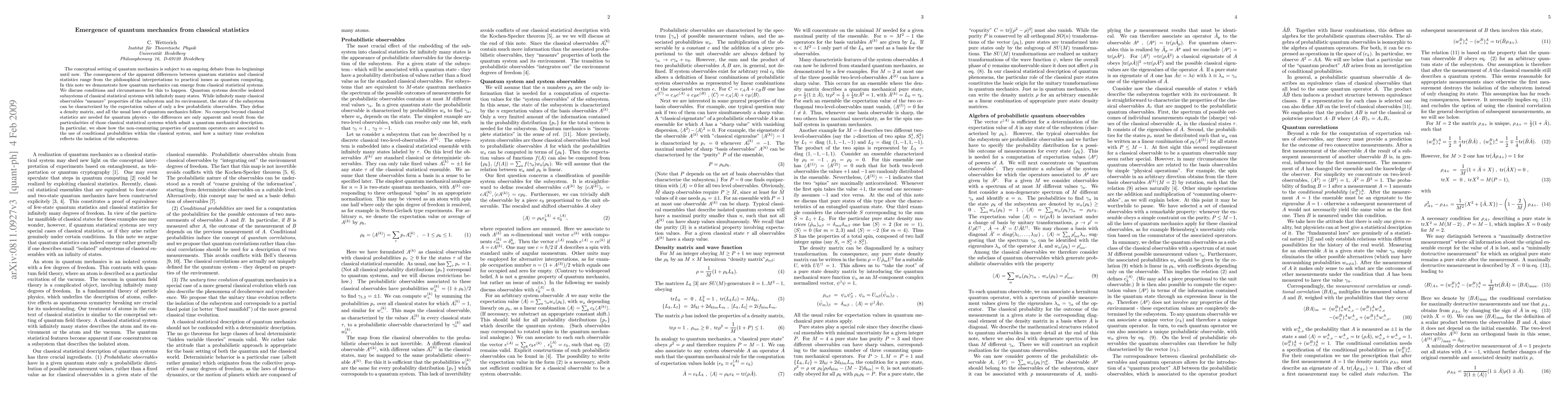 The paper demonstrates how quantum mechanics can emerge from classical statistical systems by describing quantum systems as isolated subsystems of larger classical statistical ensembles. It shows that the state of the subsystem can be characterized by the expectation values of a few probabilistic observables, leading to a density matrix that follows all usual laws of quantum mechanics without requiring concepts beyond classical statistics.