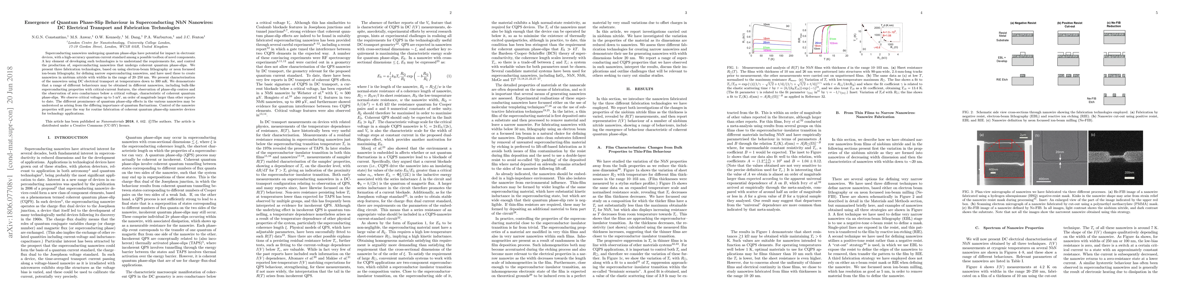 This paper explores the fabrication of superconducting NbN nanowires using advanced lithography techniques, demonstrating their quantum phase-slip behavior through DC electrical transport studies. The research highlights the potential of these nanowires for novel electronic devices, showing a range of behaviors from bulk superconductivity to coherent quantum phase-slips, with critical voltages up to 5 mV.