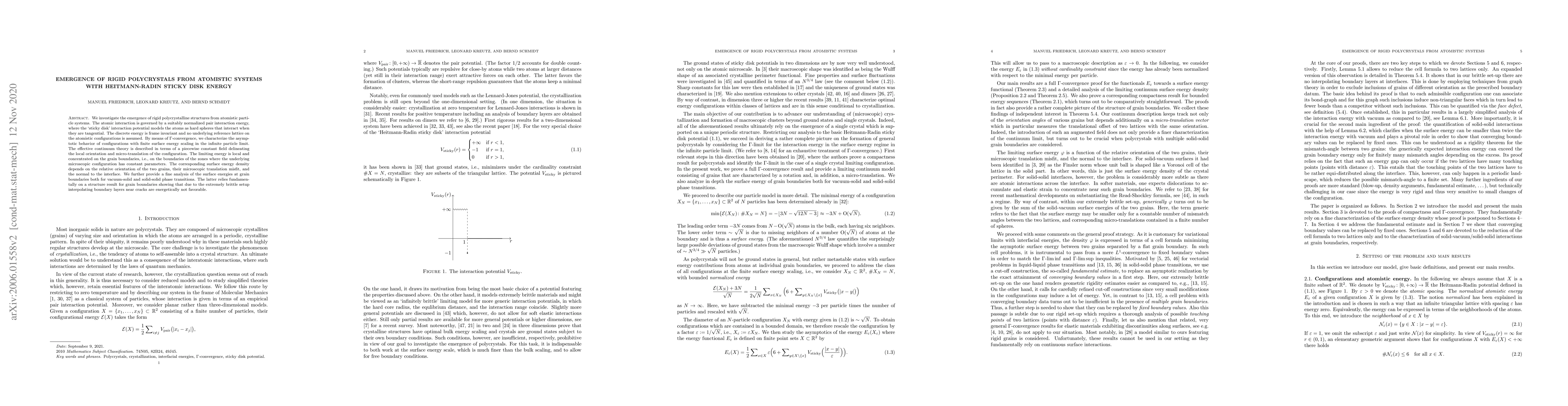 This research explores the formation of rigid polycrystalline structures from atomistic systems using a 'sticky disk' interaction potential. It employs $Gamma$-convergence to analyze the infinite particle limit, revealing a local, grain-boundary concentrated energy. The study also examines solid-solid phase transition surface energies, demonstrating that brittle setups disfavor boundary layers near cracks.