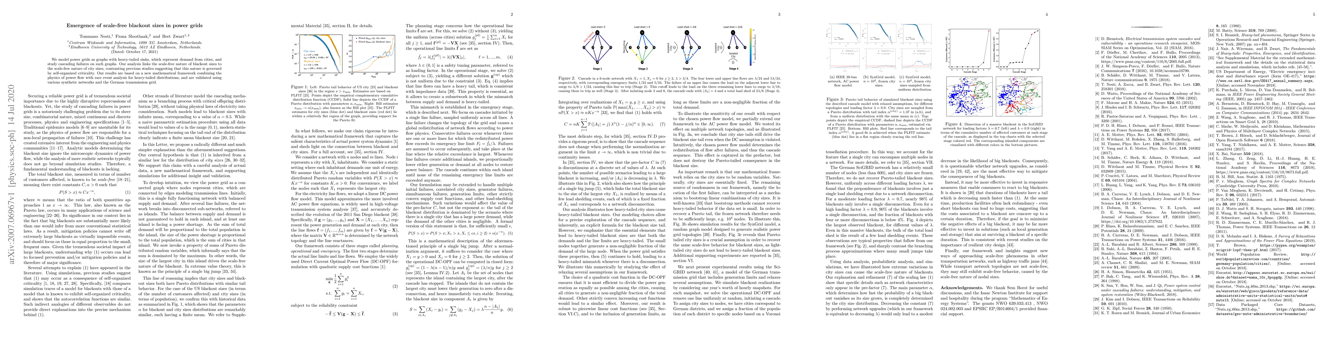This paper models power grids as graphs with heavy-tailed sinks and finds that the scale-free nature of blackout sizes correlates with the scale-free nature of city sizes, challenging previous self-organized criticality theories. The study introduces a new mathematical framework combining power flow physics with rare event analysis and validates it using synthetic networks and the German transmission grid.