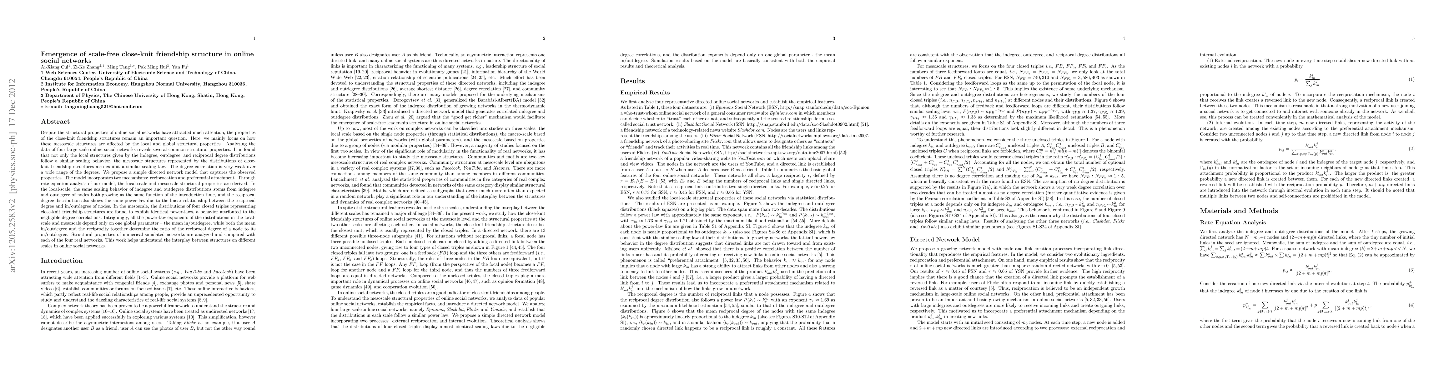Online social networks exhibit scale-free close-knit friendship structures with weak degree correlations, influenced by local and global structural properties such as indegree, outdegree, and reciprocity.