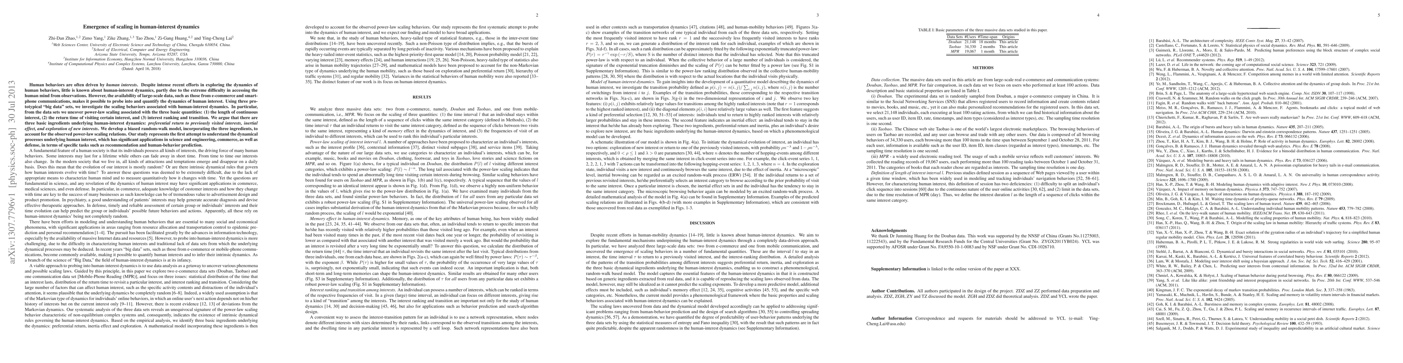 This paper investigates the scaling behaviors in human-interest dynamics using large-scale data from e-commerce and smart-phone communications, revealing power-law scaling in interest length, return time, and ranking. The study identifies three underlying ingredients: preferential return, inertial effect, and exploration, and proposes a biased random-walk model to explain these findings.