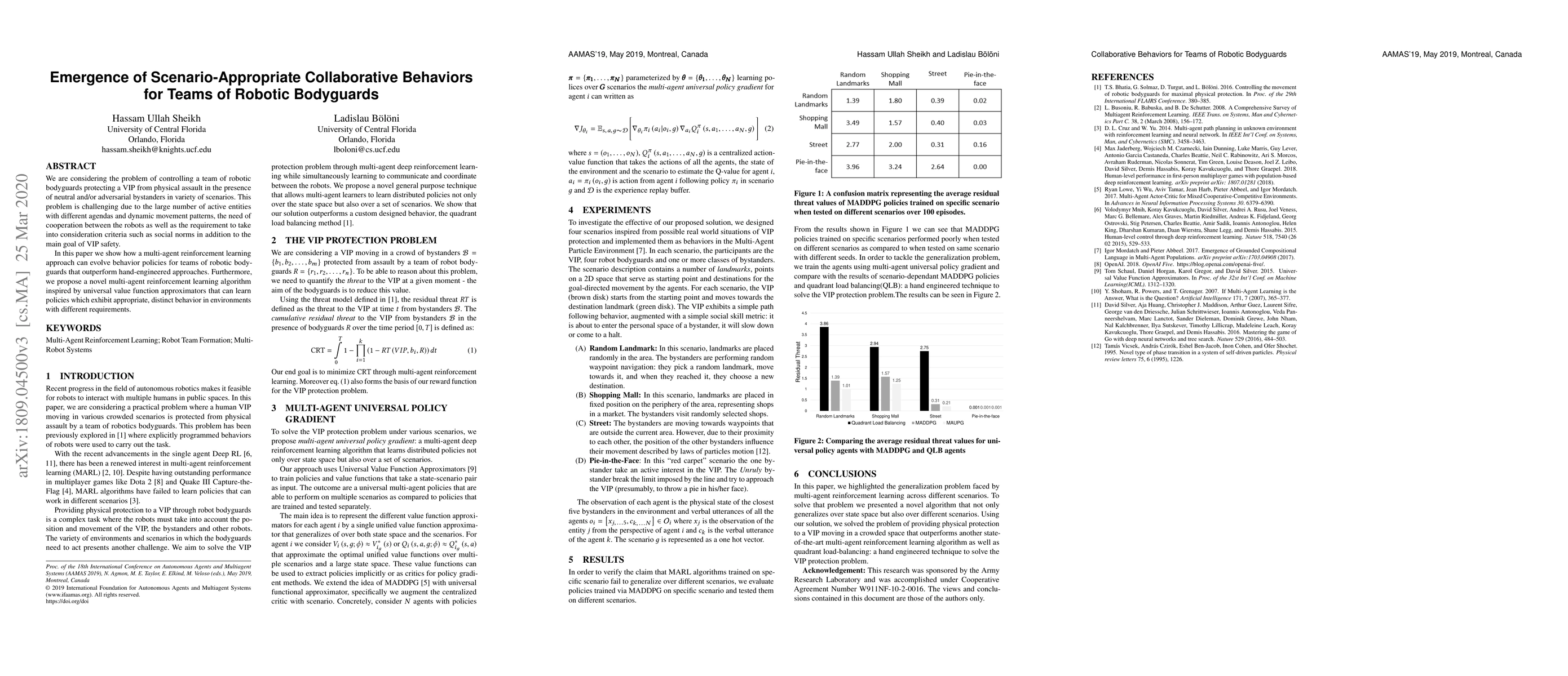 We are considering the problem of controlling a team of robotic bodyguards protecting a VIP from physical assault in the presence of neutral and/or adversarial bystanders. This task is part of a much larger class of problems involving coordinated robot behavior in the presence of humans. This problem is challenging due to the large number of active entities with different agendas, the need of cooperation between the robots as well as the requirement to take into consideration criteria such as social norms and unobtrusiveness in addition to the main goal of VIP safety. Furthermore, different settings such as street, public space or red carpet require very different behavior from the robot. We describe how a multi-agent reinforcement learning approach can evolve behavior policies for teams of robot bodyguards that compare well with hand-engineered approaches. Furthermore, we show that an algorithm inspired by universal value function approximators can learn policies that exhibit appropriate, distinct behavior in environments with different requirements.