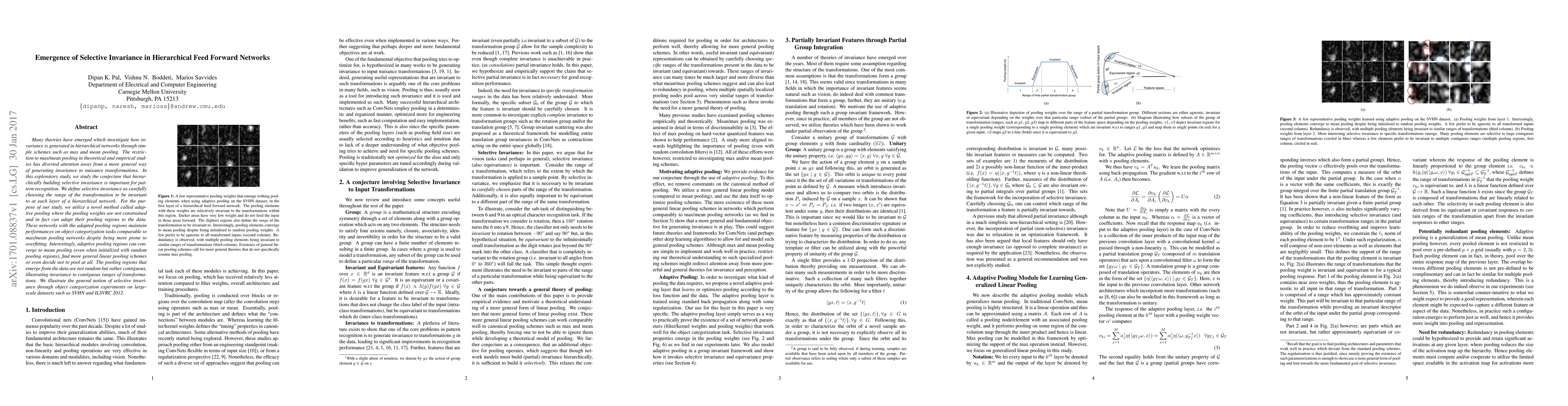 Many theories have emerged which investigate how in- variance is generated in hierarchical networks through sim- ple schemes such as max and mean pooling. The restriction to max/mean pooling in theoretical and empirical studies has diverted attention away from a more general way of generating invariance to nuisance transformations. We con- jecture that hierarchically building selective invariance (i.e. carefully choosing the range of the transformation to be in- variant to at each layer of a hierarchical network) is im- portant for pattern recognition. We utilize a novel pooling layer called adaptive pooling to find linear pooling weights within networks. These networks with the learnt pooling weights have performances on object categorization tasks that are comparable to max/mean pooling networks. In- terestingly, adaptive pooling can converge to mean pooling (when initialized with random pooling weights), find more general linear pooling schemes or even decide not to pool at all. We illustrate the general notion of selective invari- ance through object categorization experiments on large- scale datasets such as SVHN and ILSVRC 2012.