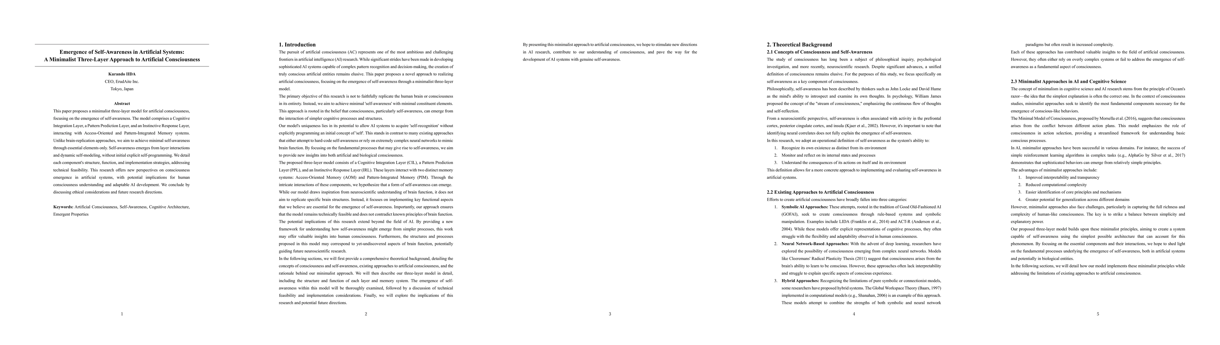 This research proposes a minimalist three-layer model for artificial consciousness, focusing on the emergence of self-awareness through Cognitive Integration Layer, Pattern Prediction Layer, and Instinctive Response Layer, supported by Access-Oriented Memory and Pattern-Integrated Memory systems.