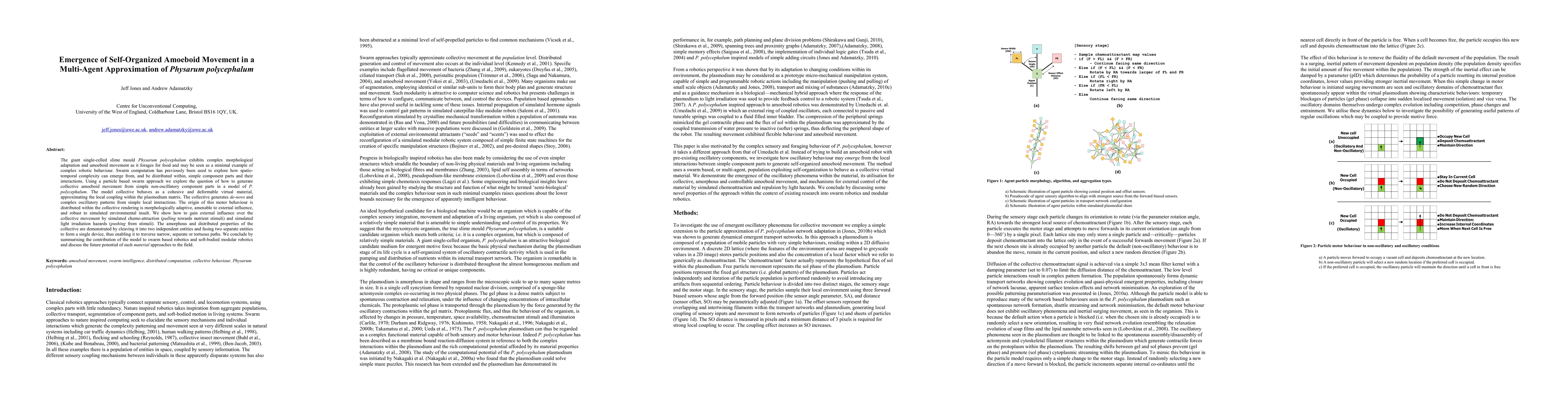 The giant single-celled slime mould Physarum polycephalum exhibits complex morphological adaptation and amoeboid movement as it forages for food and may be seen as a minimal example of complex robotic behaviour. Swarm computation has previously been used to explore how spatiotemporal complexity can emerge from, and be distributed within, simple component parts and their interactions. Using a particle based swarm approach we explore the question of how to generate collective amoeboid movement from simple non-oscillatory component parts in a model of P. polycephalum. The model collective behaves as a cohesive and deformable virtual material, approximating the local coupling within the plasmodium matrix. The collective generates de-novo and complex oscillatory patterns from simple local interactions. The origin of this motor behaviour is distributed within the collective rendering is morphologically adaptive, amenable to external influence, and robust to simulated environmental insult. We show how to gain external influence over the collective movement by simulated chemo-attraction (pulling towards nutrient stimuli) and simulated light irradiation hazards (pushing from stimuli). The amorphous and distributed properties of the collective are demonstrated by cleaving it into two independent entities and fusing two separate entities to form a single device, thus enabling it to traverse narrow, separate or tortuous paths. We conclude by summarising the contribution of the model to swarm based robotics and soft-bodied modular robotics and discuss the future potential of such material approaches to the field.