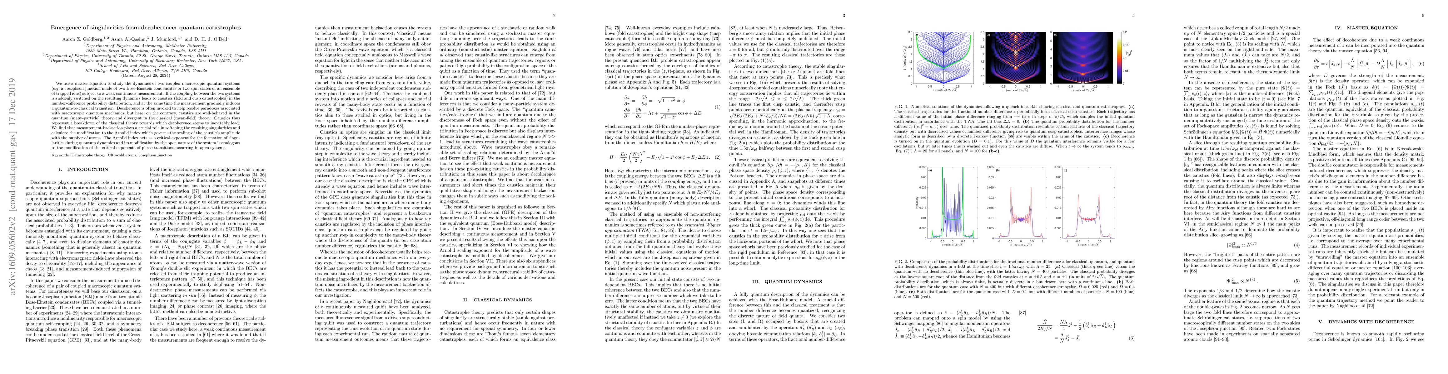 We use a master equation to study the dynamics of two coupled macroscopic quantum systems (e.g.\ a Josephson junction made of two Bose-Einstein condensates or two spin states of an ensemble of trapped ions) subject to a weak continuous measurement. If the coupling between the two systems is suddenly switched on the resulting dynamics leads to caustics (fold and cusp catastrophes) in the number-difference probability distribution, and at the same time the measurement gradually induces a quantum-to-classical transition. Decoherence is often invoked to help resolve paradoxes associated with macroscopic quantum mechanics, but here, on the contrary, caustics are well-behaved in the quantum (many-particle) theory and divergent in the classical (mean-field) theory. Caustics thus represent a breakdown of the classical theory towards which decoherence seems to inevitably lead. We find that measurement backaction plays a crucial role in softening the resulting singularities and calculate the modification to the Arnol'd index which governs the scaling of the caustic's amplitude with the number of atoms. The Arnol'd index acts as a critical exponent for the formation of singularities during quantum dynamics and its modification by the open nature of the system is analogous to the modification of the critical exponents of phase transitions occurring in open systems.