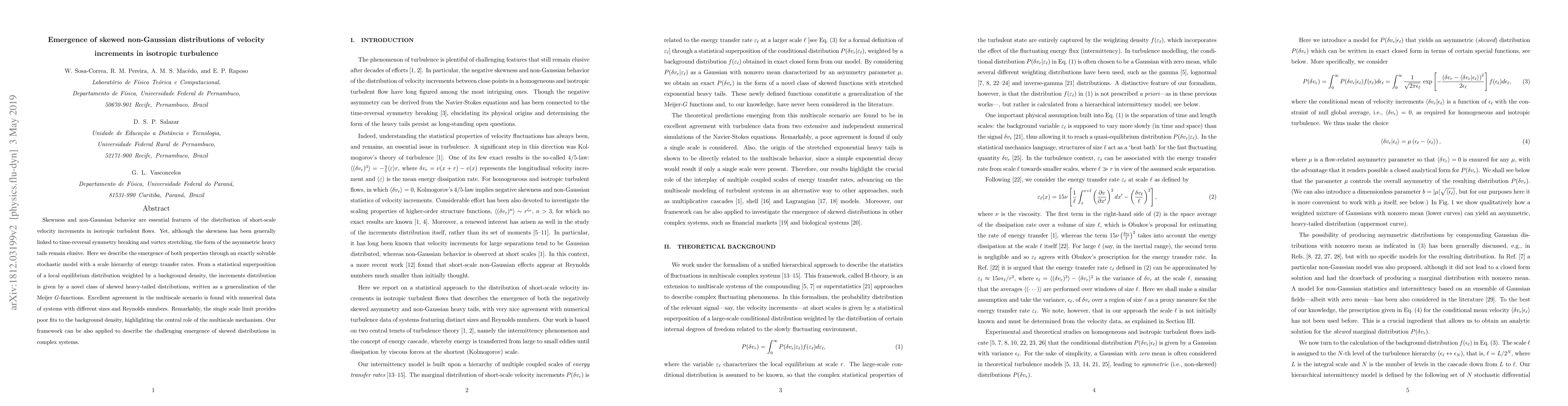 Skewness and non-Gaussian behavior are essential features of the distribution of short-scale velocity increments in isotropic turbulent flows. Yet, although the skewness has been generally linked to time-reversal symmetry breaking and vortex stretching, the form of the asymmetric heavy tails remain elusive. Here we describe the emergence of both properties through an exactly solvable stochastic model with a scale hierarchy of energy transfer rates. From a statistical superposition of a local equilibrium distribution weighted by a background density, the increments distribution is given by a novel class of skewed heavy-tailed distributions, written as a generalization of the Meijer $G$-functions. Excellent agreement in the multiscale scenario is found with numerical data of systems with different sizes and Reynolds numbers. Remarkably, the single scale limit provides poor fits to the background density, highlighting the central role of the multiscale mechanism. Our framework can be also applied to describe the challenging emergence of skewed distributions in complex systems.