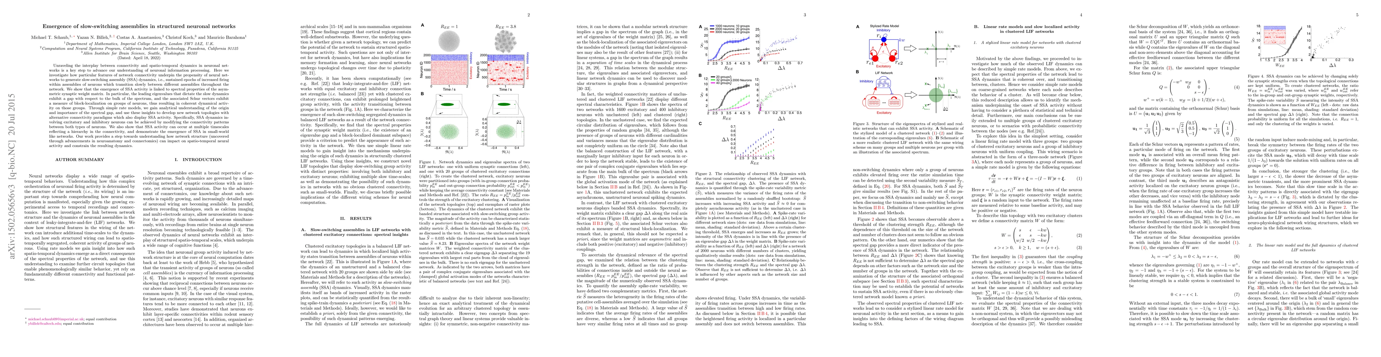 Unraveling the interplay between connectivity and spatio-temporal dynamics in neuronal networks is a key step to advance our understanding of neuronal information processing. Here we investigate how particular features of network connectivity underpin the propensity of neural networks to generate slow-switching assembly (SSA) dynamics, i.e., sustained epochs of increased firing within assemblies of neurons which transition slowly between different assemblies throughout the network. We show that the emergence of SSA activity is linked to spectral properties of the asymmetric synaptic weight matrix. In particular, the leading eigenvalues that dictate the slow dynamics exhibit a gap with respect to the bulk of the spectrum, and the associated Schur vectors exhibit a measure of block-localization on groups of neurons, thus resulting in coherent dynamical activity on those groups. Through simple rate models, we gain analytical understanding of the origin and importance of the spectral gap, and use these insights to develop new network topologies with alternative connectivity paradigms which also display SSA activity. Specifically, SSA dynamics involving excitatory and inhibitory neurons can be achieved by modifying the connectivity patterns between both types of neurons. We also show that SSA activity can occur at multiple timescales reflecting a hierarchy in the connectivity, and demonstrate the emergence of SSA in small-world like networks. Our work provides a step towards understanding how network structure (uncovered through advancements in neuroanatomy and connectomics) can impact on spatio-temporal neural activity and constrain the resulting dynamics.