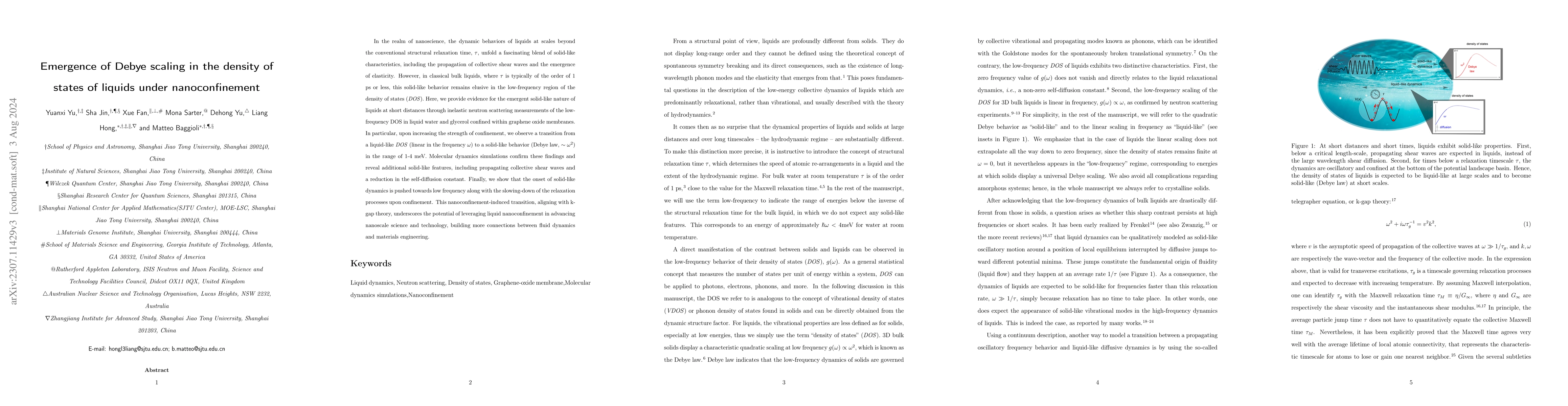 This study demonstrates that liquid water and glycerol confined within graphene oxide membranes exhibit solid-like vibrational density of states following Debye scaling at low frequencies, transitioning from a liquid-like to solid-like behavior with increasing confinement. Molecular dynamics simulations corroborate these findings, revealing additional solid-like features such as collective shear waves and reduced self-diffusion.