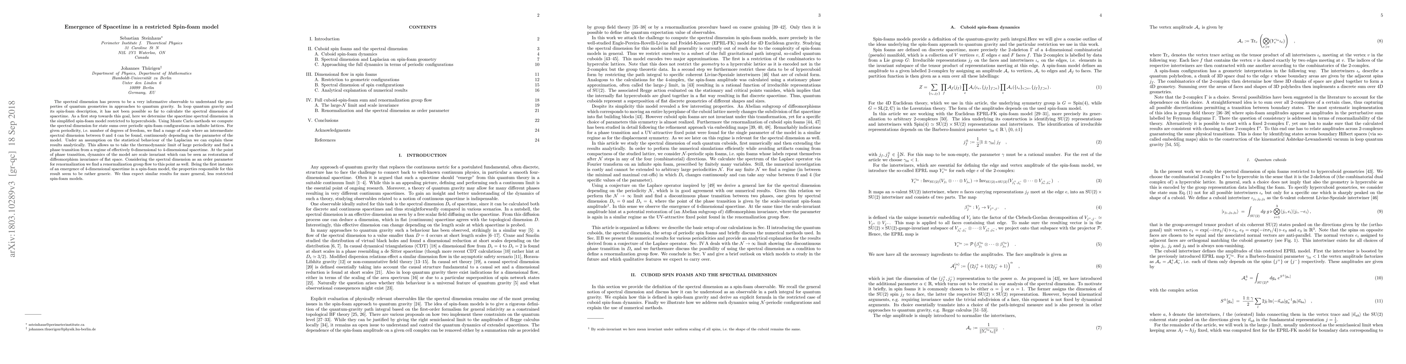 This paper calculates the spacetime spectral dimension in a simplified spin foam model restricted to hypercuboids, finding an intermediate spectral dimension between 0 and 4. It reveals a phase transition to effectively 4-dimensional spacetime, indicating the emergence of diffeomorphism invariance and a renormalization group flow towards this transition.