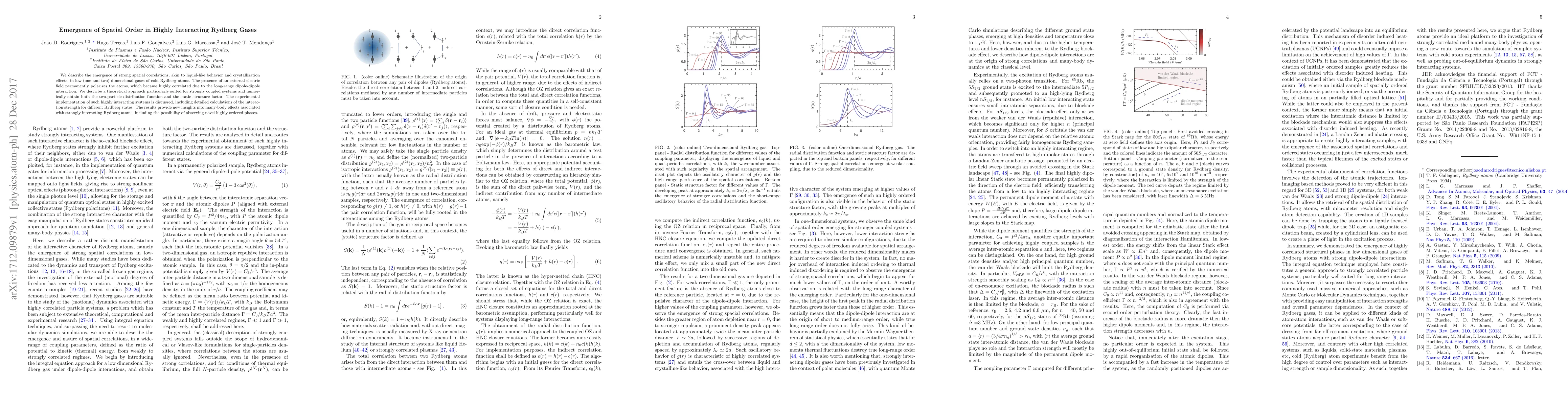 This paper investigates the emergence of spatial order in low-dimensional Rydberg gases under strong dipole-dipole interactions, revealing liquid-like correlations and potential crystallization. Theoretical and numerical analyses predict new phases in highly interacting Rydberg systems, with implications for experimental setups.