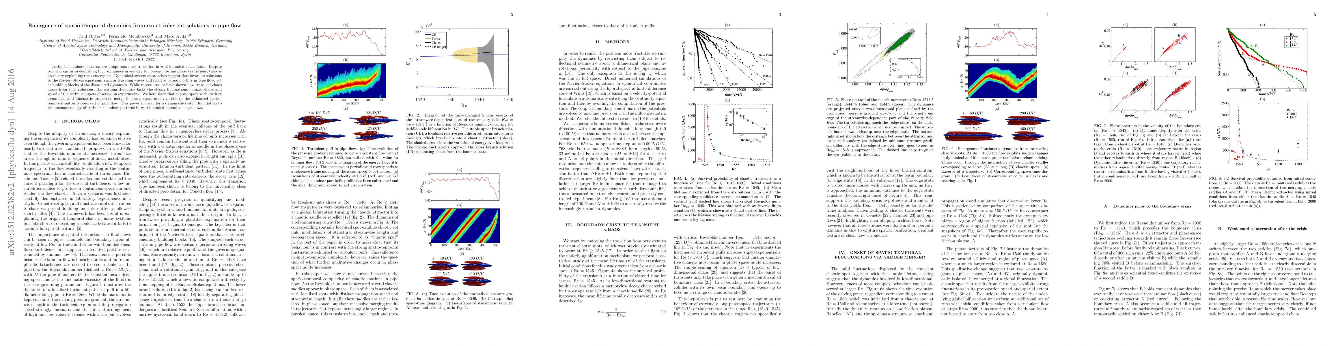 Turbulent-laminar patterns are ubiquitous near transition in wall-bounded shear flows. Despite recent progress in describing their dynamics in analogy to non-equilibrium phase transitions, there is no theory explaining their emergence. Dynamical-system approaches suggest that invariant solutions to the Navier--Stokes equations, such as traveling waves and relative periodic orbits in pipe flow, act as building blocks of the disordered dynamics. While recent studies have shown how transient chaos arises from such solutions, the ensuing dynamics lacks the strong fluctuations in size, shape and speed of the turbulent spots observed in experiments. We here show that chaotic spots with distinct dynamical and kinematic properties merge in phase space and give rise to the enhanced spatio-temporal patterns observed in pipe flow. This paves the way for a dynamical-system foundation to the phenomenology of turbulent-laminar patterns in wall-bounded extended shear flows.